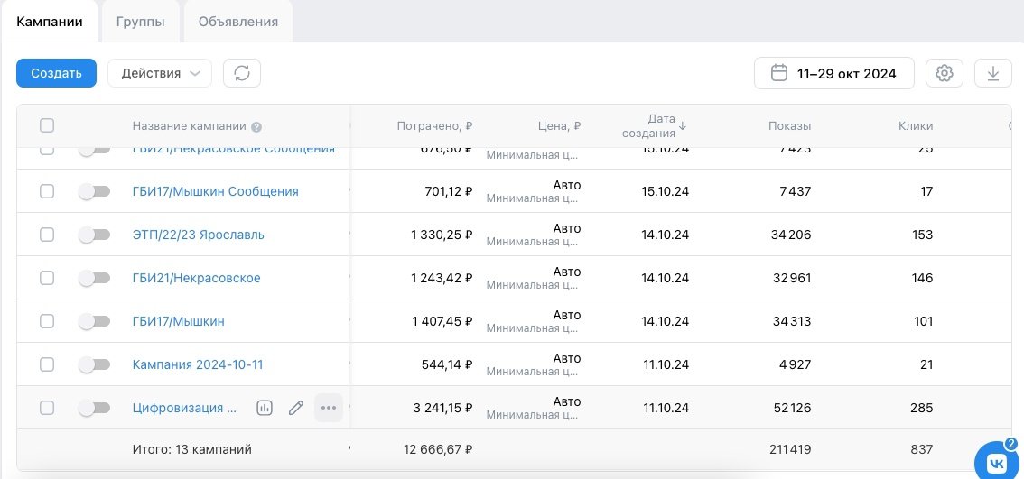- Было запущено 12 рекламных кампаний с целями «переходы на сайт» и «переход в сообщество».