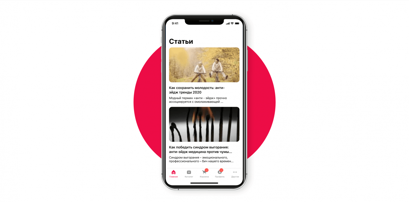 Первое, что видит пользователь, войдя в приложение — это слайдер с баннерам акций, новые товары из каталога и свежие публикации из раздела «Статьи». На главный экран можно выводить текст, изображения, видео и собирать его внешний вид из блоков как конструктор.