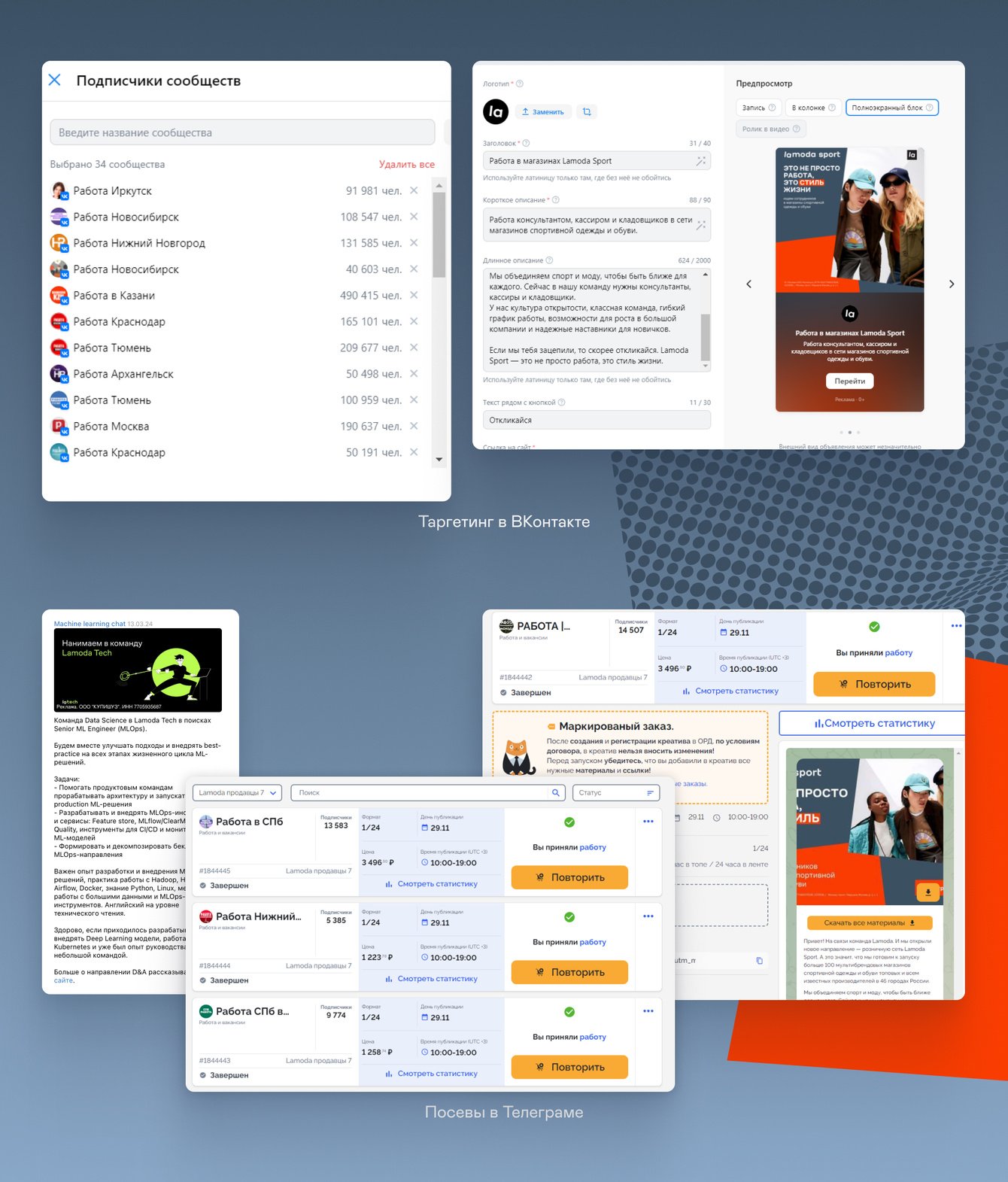 Для каждой вакансии формировался отдельный рекламный поток. Например, мы искали водителей-курьеров для доставки заказов, и для размещения объявлений в ВКонтакте и Телеграм мы: