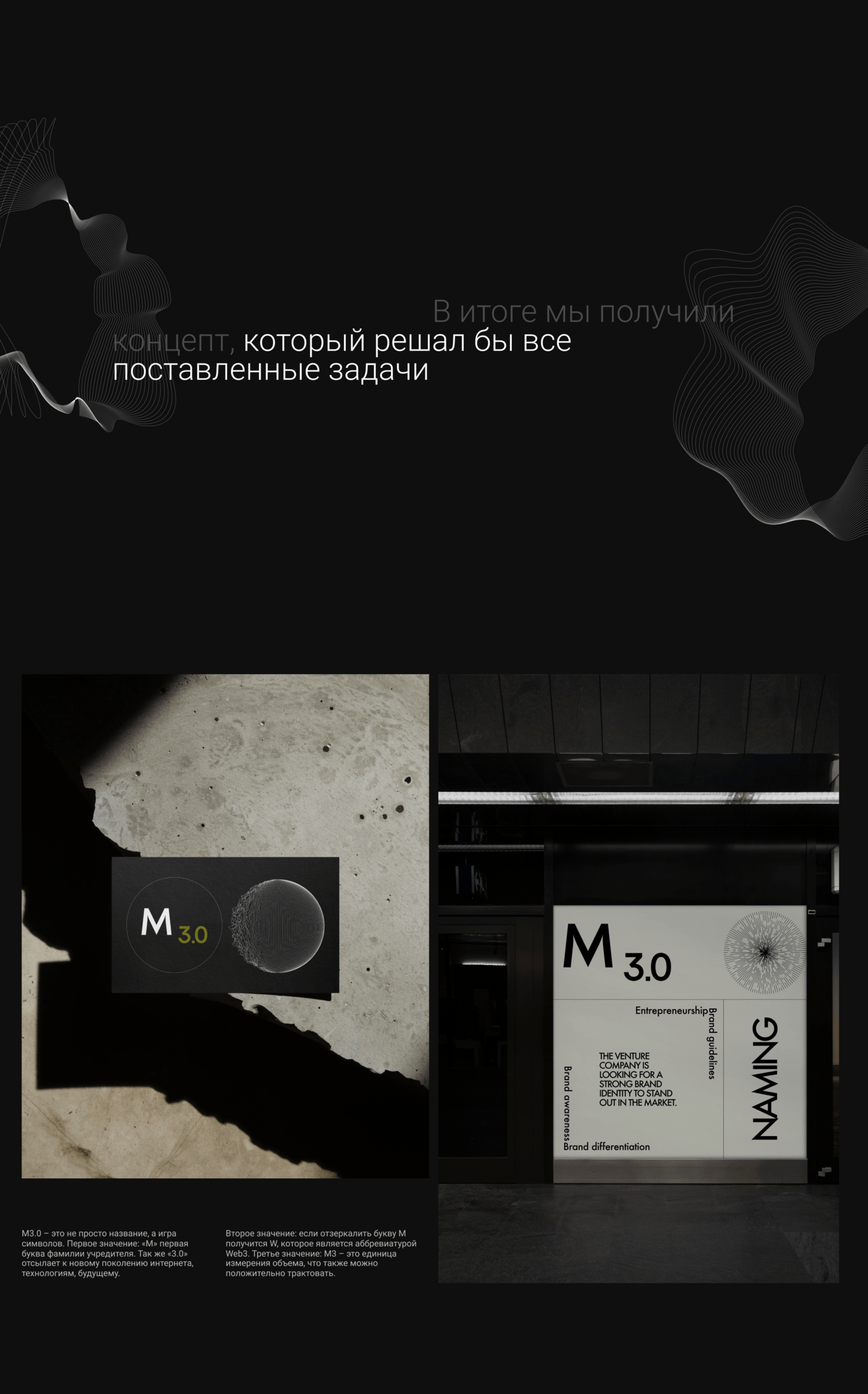M3.0 – это не просто название, а игра символов. Первое значение: «М» первая буква фамилии учредителя. Так же «3.0» отсылает к новому поколению интернета, технологиям, будущему. Второе значение: если отзеркалить букву М получится W, которое является аббревиатурой Web3. Третье значение: M3 – это единица измерения объема, что также можно положительно трактовать.