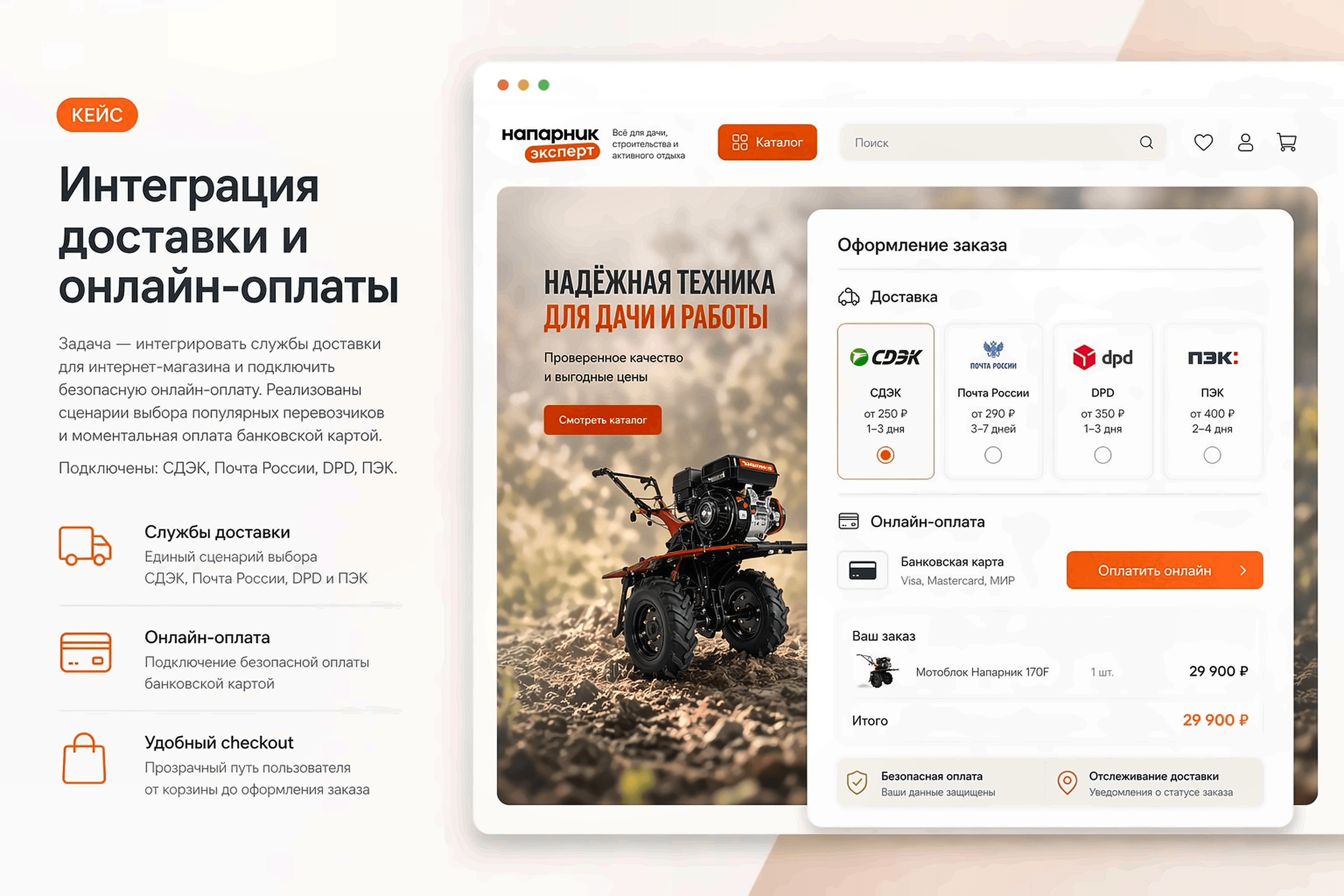 Для e-commerce-проекта этого уровня уже недостаточно просто аккуратного интерфейса. Пользователь ожидает быстрый, понятный и бесшовный путь к покупке. Бизнес — надёжные интеграции, корректную работу каталога, удобную доставку, онлайн-оплату и административную среду, которая не тормозит процессы.