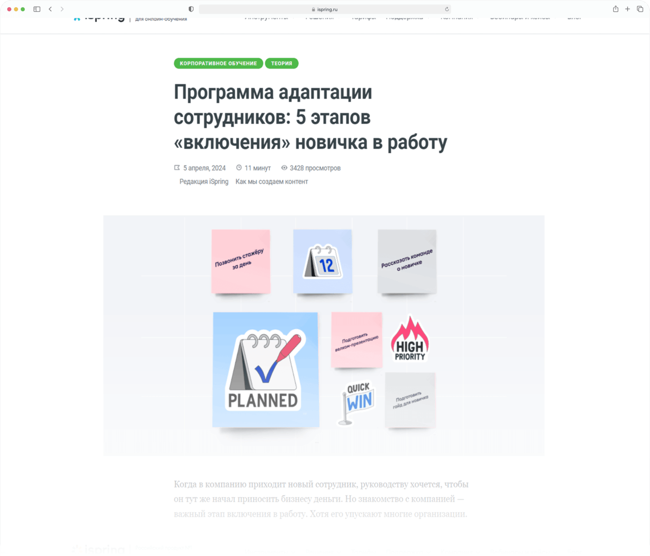 Подробно расписали каждый этап программы адаптации, показали пример, как может выглядеть план с мероприятиями по адаптации сотрудников в общем виде. Для нативной интеграции использовали комбо-прием: рассказали, как известные бренды используют инструменты от iSpring для адаптации персонала. Тем самым убили сразу двух зайцев: показали реальные примеры применения онлайн-продуктов и подчеркнули, что клиент работает с крупными заказчиками: Unilever, Эконика, iGoods.