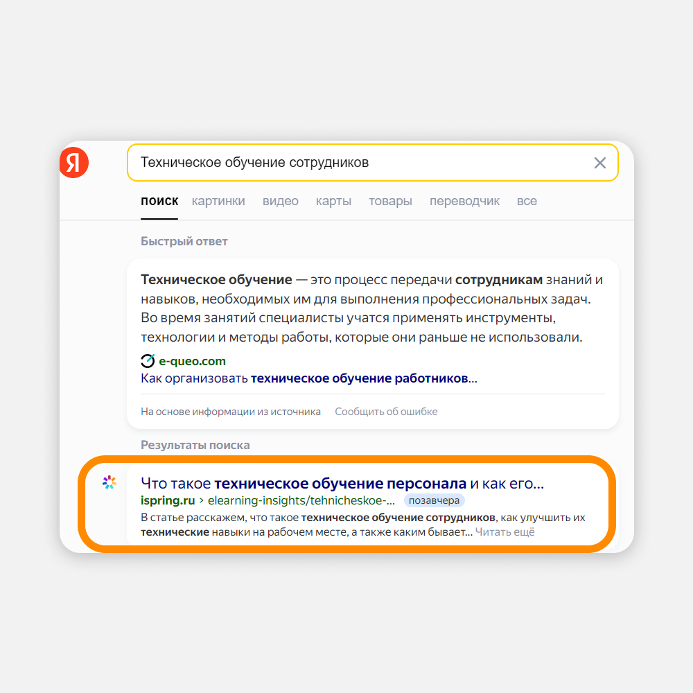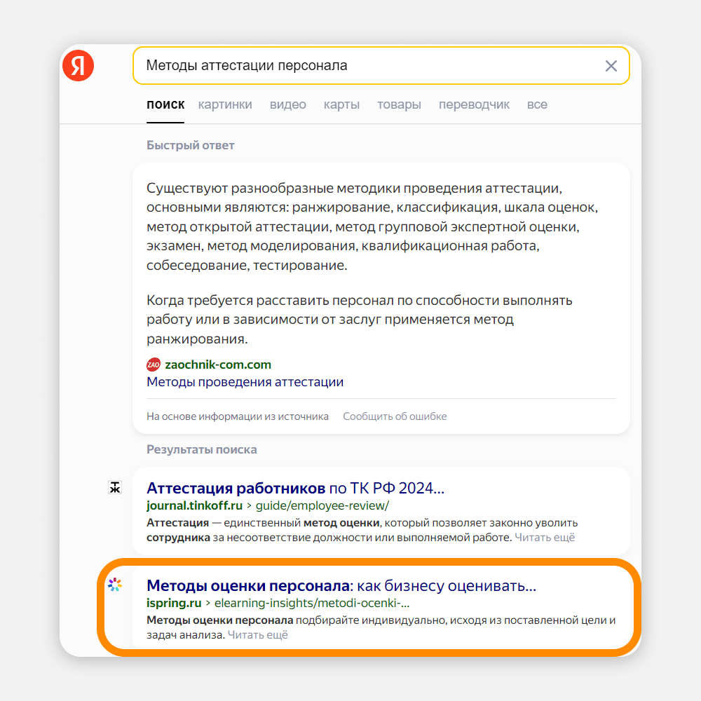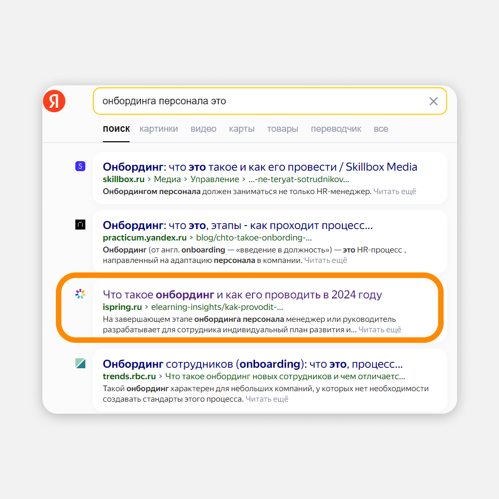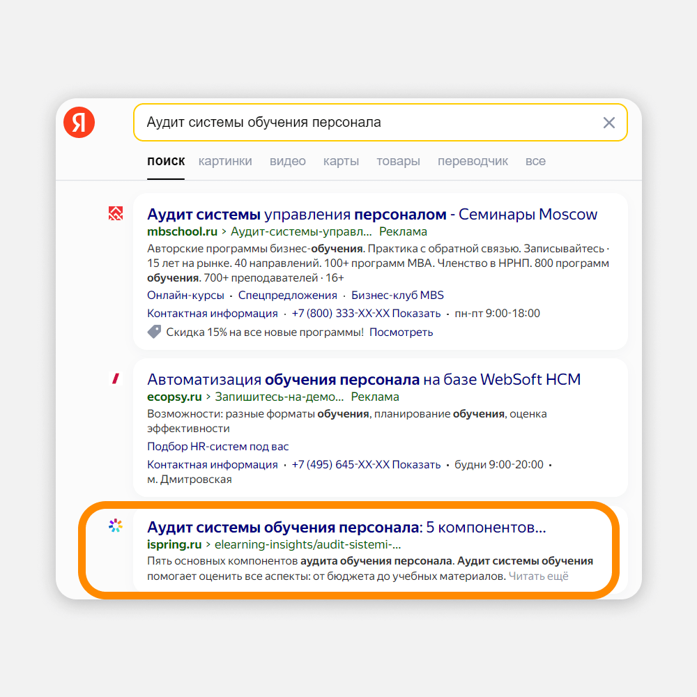 iSpring — B2B-проект. В сегменте «бизнес для бизнеса» аудитория всегда узкая: она ищет информацию для выполнения своей работы. Если выбрать для SEO правильные ключевые запросы, все сложится: вы дадите клиенту нужную информацию, а он как минимум узнает о бренде. Как максимум — станет клиентом. Смотрите на примере: