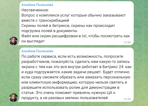 В результате после всех уточнений и дополнений заказчик принял текст практически без правок — вот он: https://vc.ru/tribuna/1367981-transkribator-dlya-biznesa-s-lichnym-kabinetom-i-integraciei-s-bitriks24-chem-horosh-helprobot-dialog
