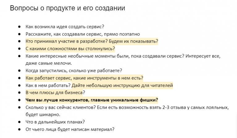 Продуктовая статья — сложный материал, нужно собрать максимум информации. Мы подготовили бриф с несколькими группами вопросов.