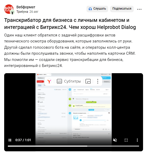 Задача - рассказать потенциальным пользователям о новом сервисе — транскрибаторе для бизнеса, его возможностях и функционале. Обеспечить хороший охват публикации, трафик на сайт и по возможности — конверсии.