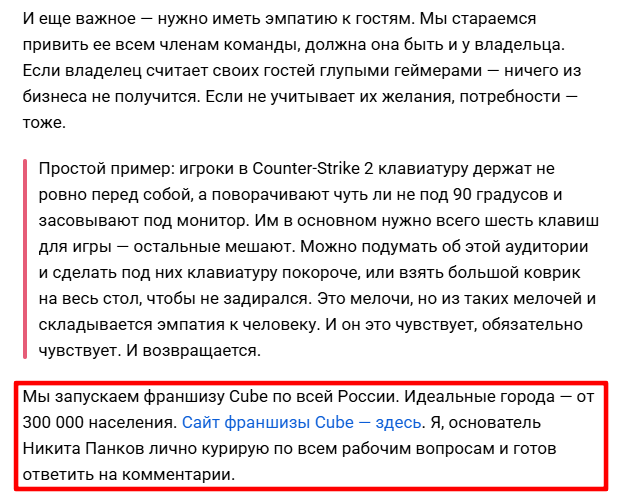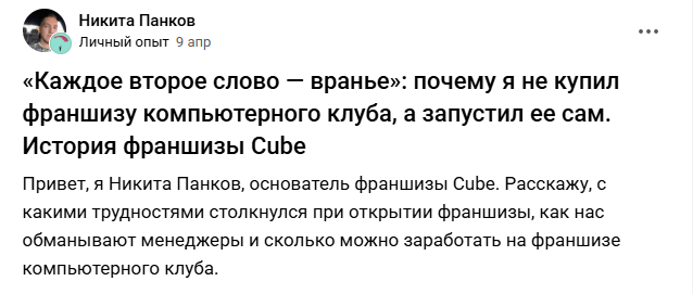 Текст находится здесь: https://vc.ru/life/1914207-franshiza-cube-kak-ya-otkryl-kompyuternyy-klub