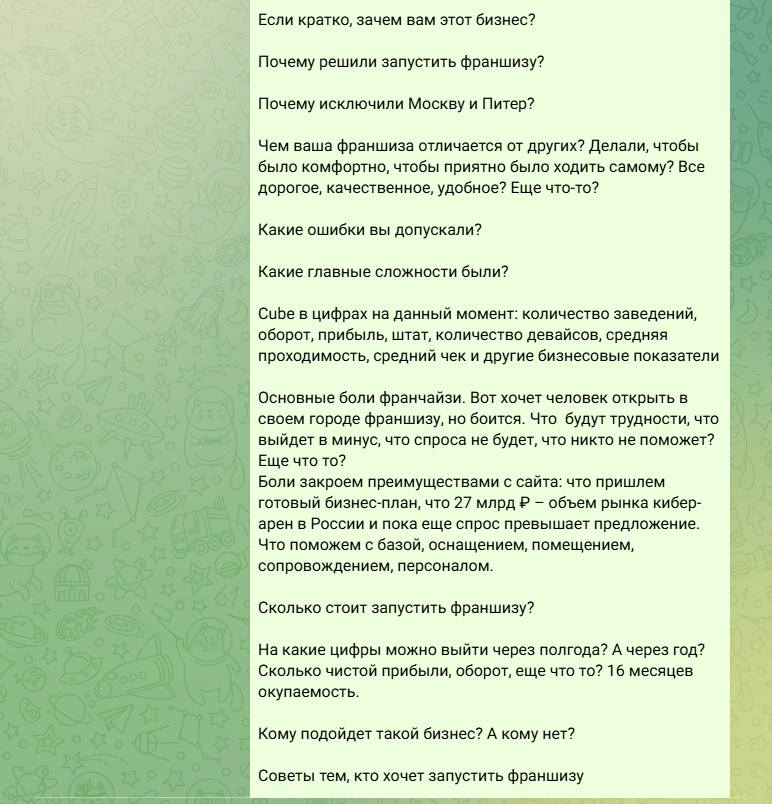 Сделали акцент на цифрах. Мы помогаем продавать франшизу — должны говорить на языке бизнеса. Нужны не только красивые слова, но и цифры, факты, доказательства, расчеты.