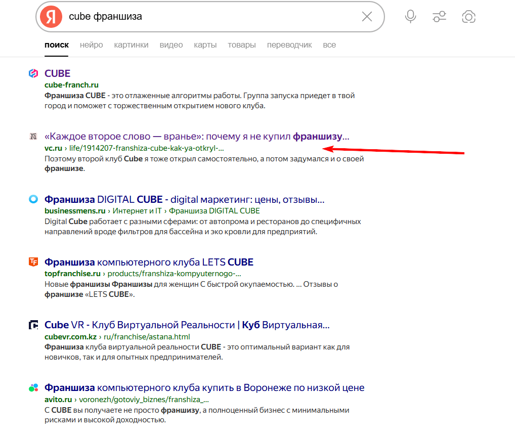 1. Мы хорошо подготовились к старту продаж франшизы — статья быстро проиндексировалась и уже месяц остается в топе сразу после сайта франшизы. Если потенциальный покупатель наберет в поиске соответствующий запрос, он увидит статью и, возможно, перейдет по ссылке. Все, как и хотел Никита.
