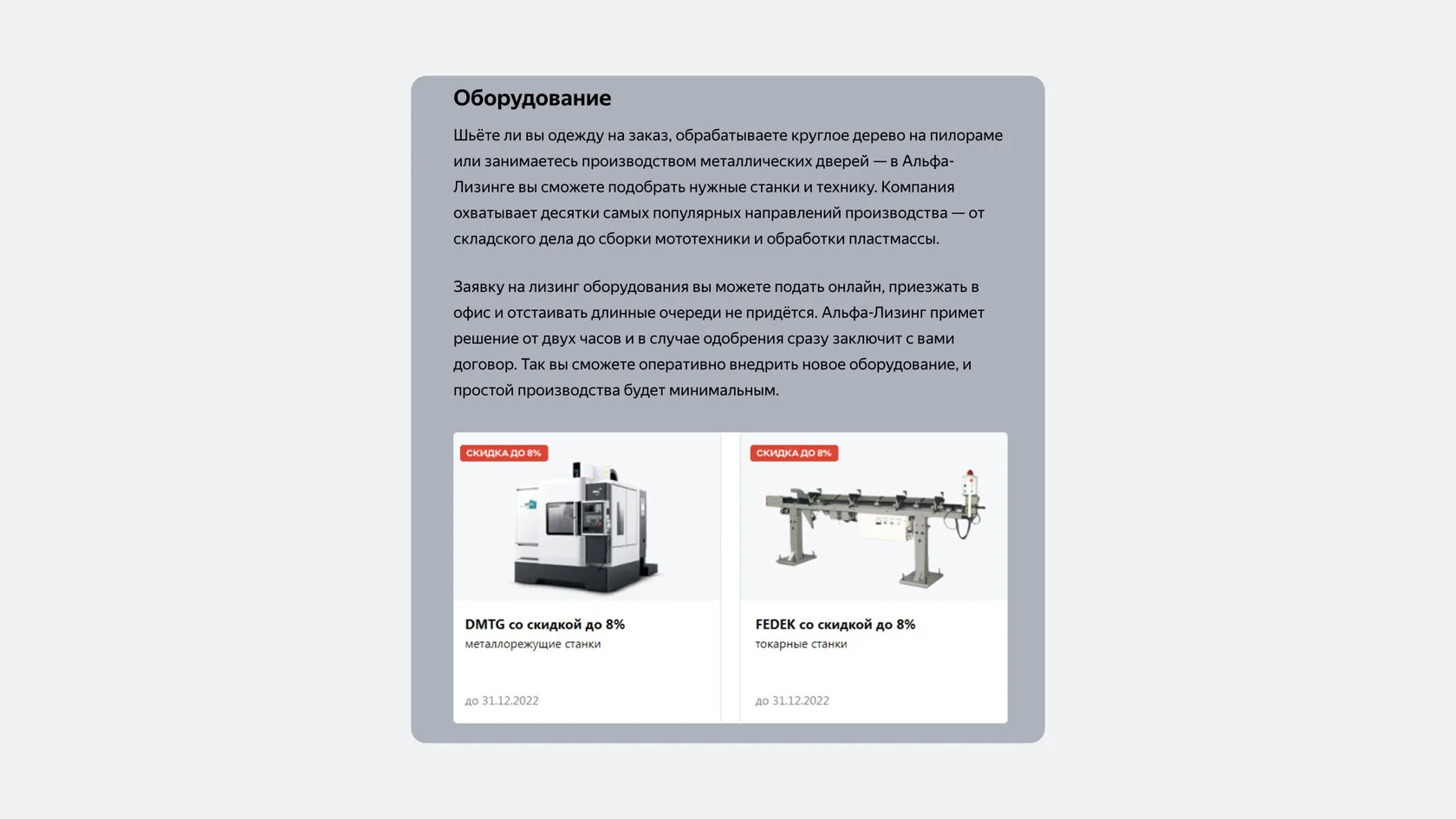 Обычно лизинг ассоциируется с легковыми авто, но в Альфа-Лизинге также можно взять оборудование, грузовые машины и спецтехнику. В статье нам нужно было показать аудитории это разнообразие предложений.