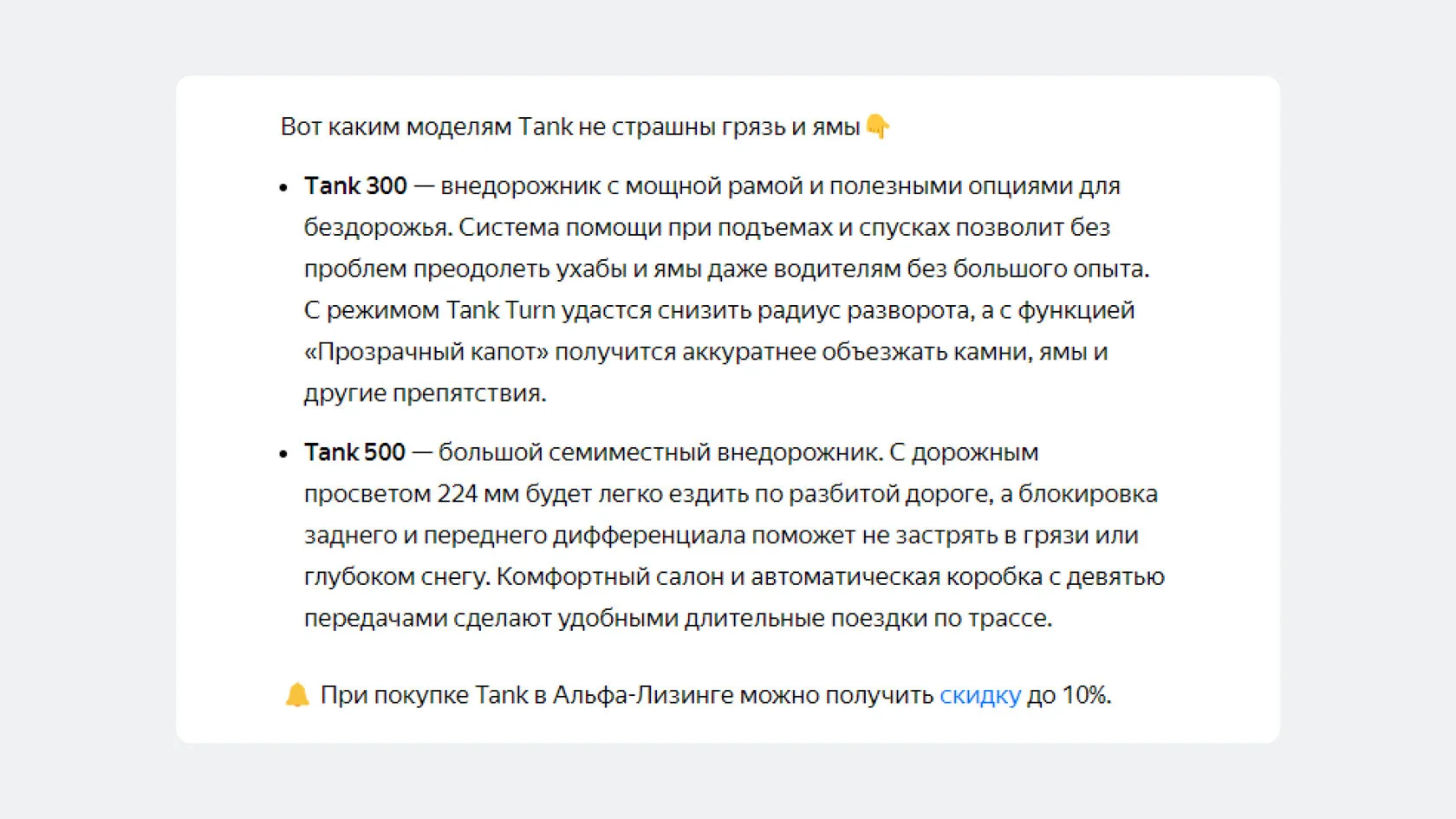 Чтобы привлечь и «дожать» аудиторию, которая находится на этапе выбора автомобиля, мы собрали подборку наиболее популярных среди клиентов Альфа-Лизинга марок. Выделили преимущества каждой из них и раскрыли на примере конкретных моделей.