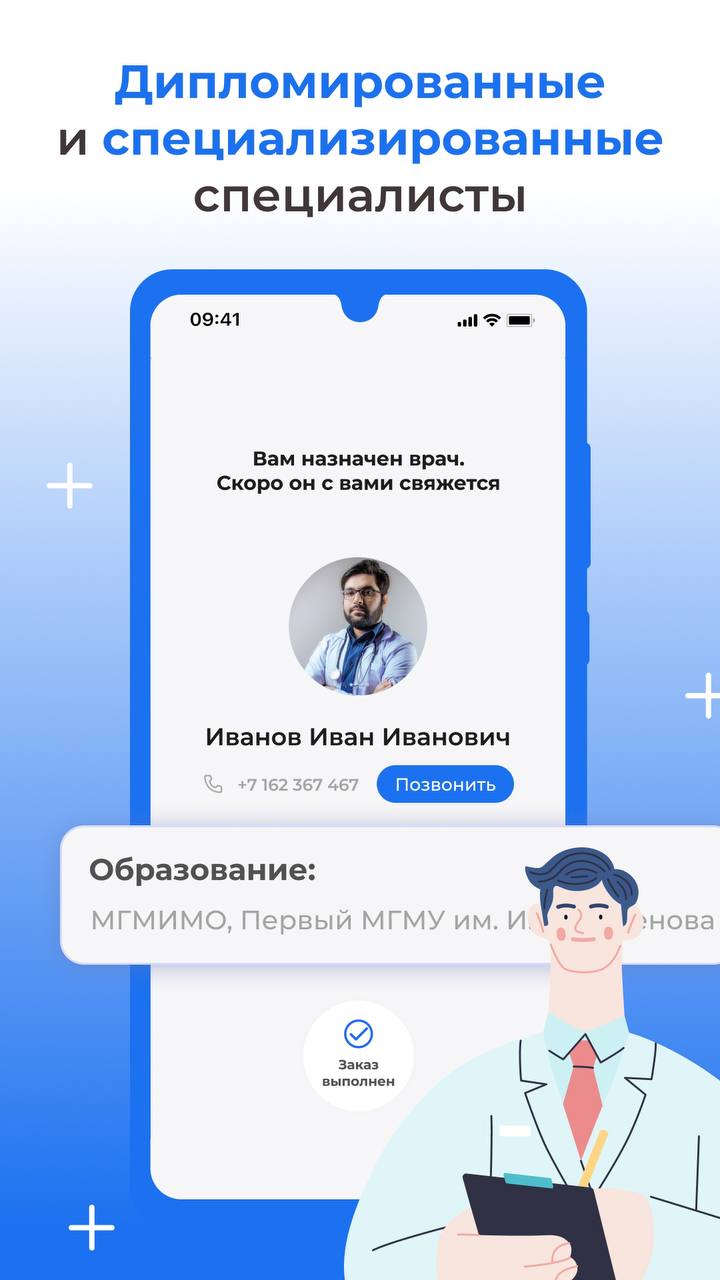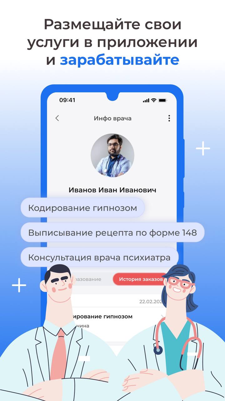 Второе приложение - приложение для врача. Пользователь регистрируется и проходит проверку, чтобы некомпетентные люди не могли присоединиться к системе. Заказы, созданные диспетчерами, публикуются в ленте врачей. Врач берет заказ оплачивает небольшую сумму, за доступ к контактам пациента.
