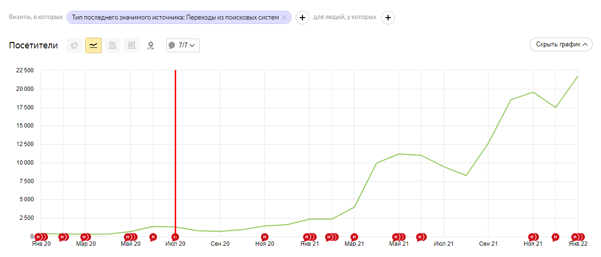 За время работы с проектом, трафик из поиска вырос в 11 раз - с 2 000 до 22 000 посетителей в месяц.
