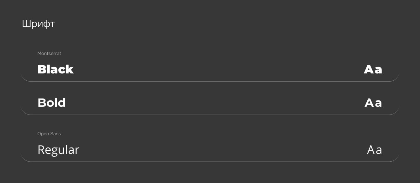 Для заголовков мы выбрали декоративный шрифт Montserrat. Он гармонично вписался в концепцию проекта. Для основного текста - Open Sans, свободный шрифт с прямым штрихом, открытыми формами и нейтральной, но дружественной внешностью. Он идеально читается при печати, в веб- и мобильных интерфейсах.