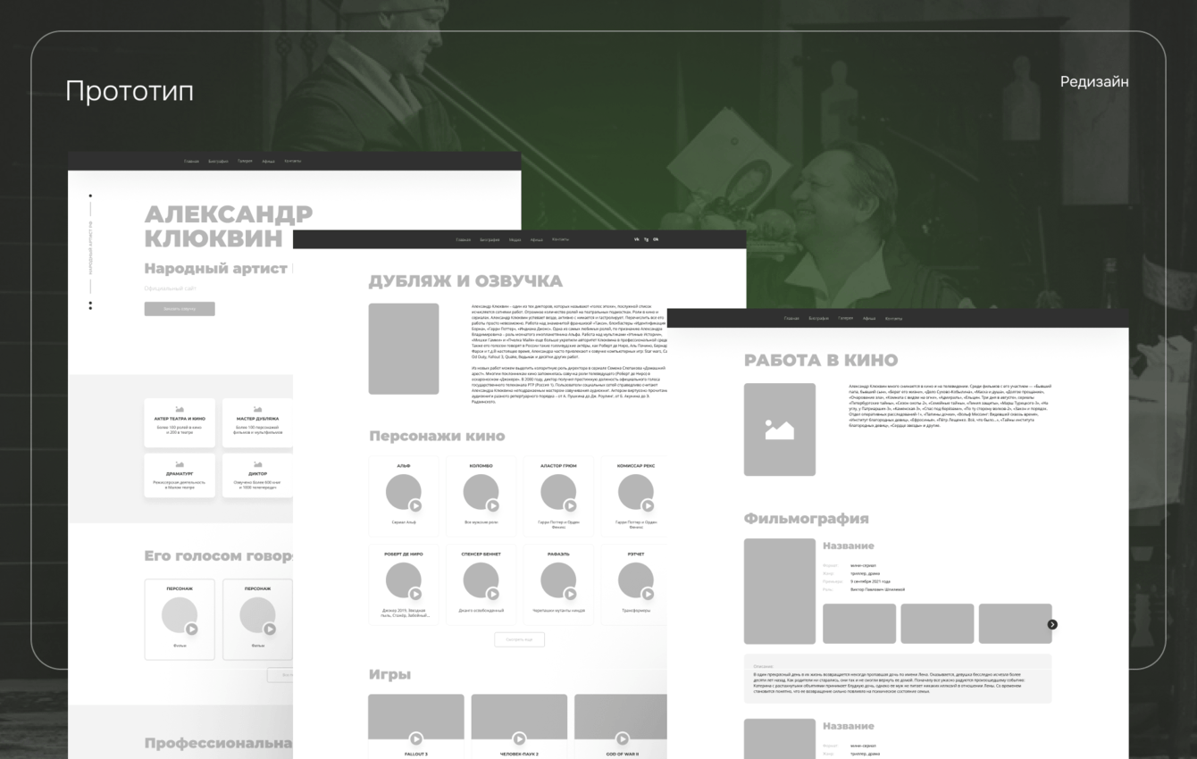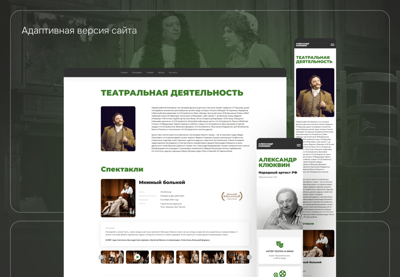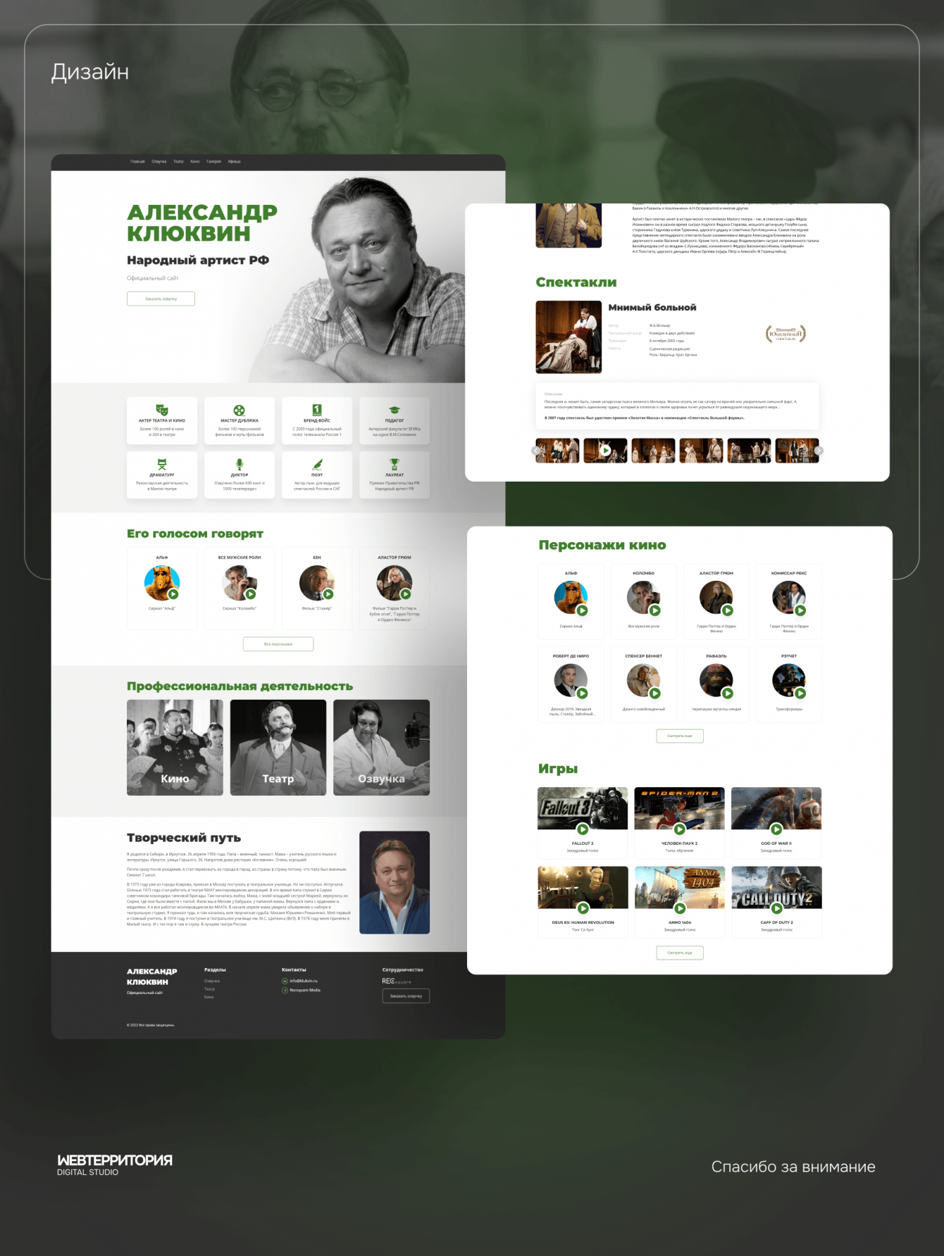 Для создания сайта мы выбрали минималистичный дизайн, чтобы фокусировалось внимание на персоне Александра Клюквина и его творческих достижениях. Основной акцент сделан на удобстве пользователя и легкости навигации. Использование крупных изображений и простого интерфейса помогло сделать сайт современным и интуитивно понятным. Это решение позволило сделать контент максимально доступным и визуально привлекательным.