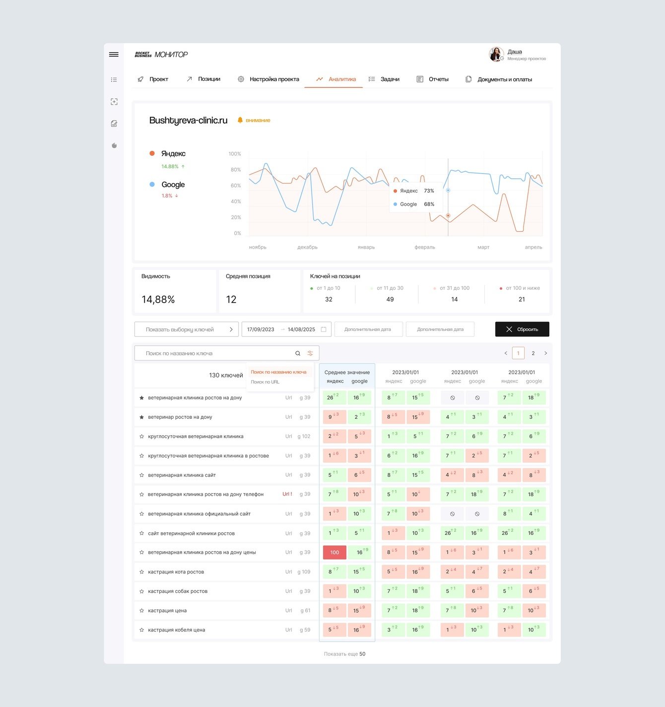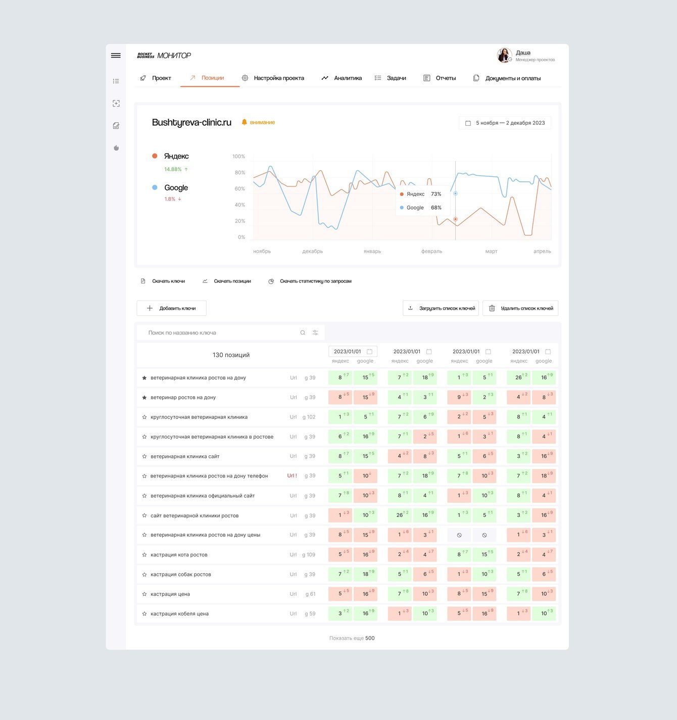 Уровень доступа — менеджер. Может добавлять новые проекты, но в системе видит только своих клиентов. Отслеживает динамику по позициям, мониторит сообщения об ошибках на сайте, делает нужные выгрузки к отчетной дате.