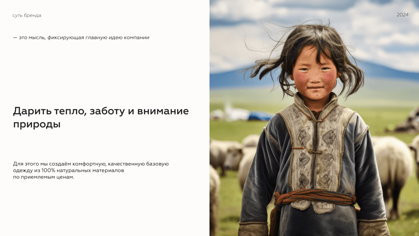 Чтобы бренд вдохновлял, мотивировал аудиторию, мы сформулировали его миссию: Дарить людям тепло, комфорт и ощущение гармонии, создавая одежду из натуральных тканей, с уважением к традициям и окружающей среде.