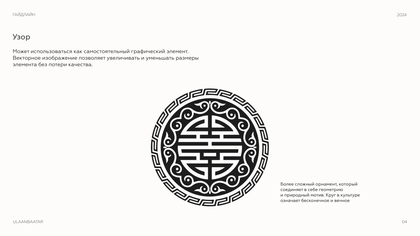 Круглый орнамент объединяет природные и культурные мотивы Монголии. Визуально он добавляет аутентичности и выделяет бренд среди конкурентов.