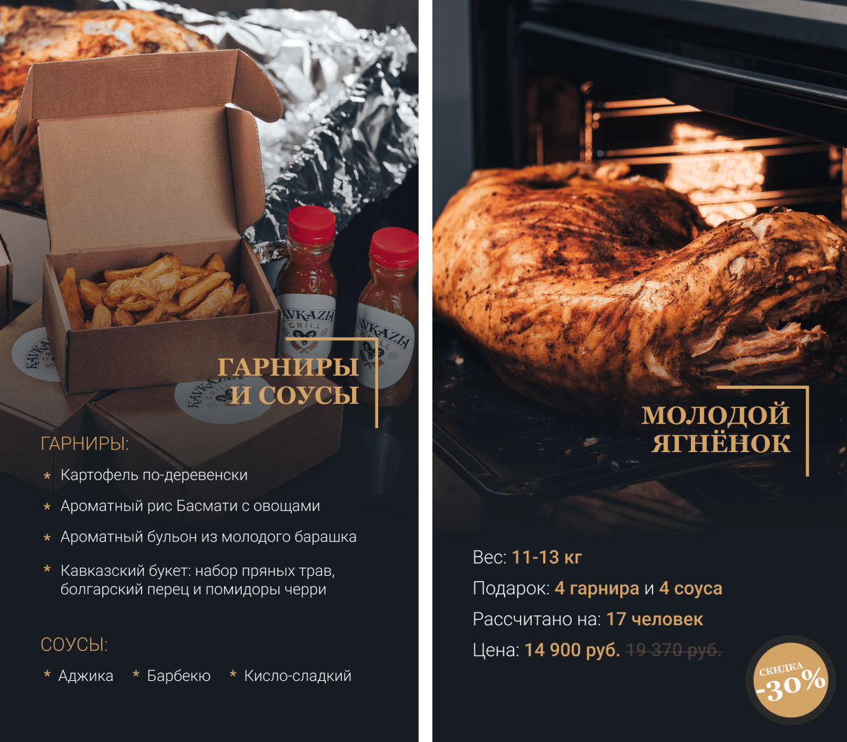 В 2020 году компания только выходила на рынок, но уже активно развивалась и пополняла каталог блюд — целый запеченный барашек, половина барашка, запеченная индейка и фаршированная утка. Ей было важно выходить на новых клиентов и увеличивать узнаваемость бренда.