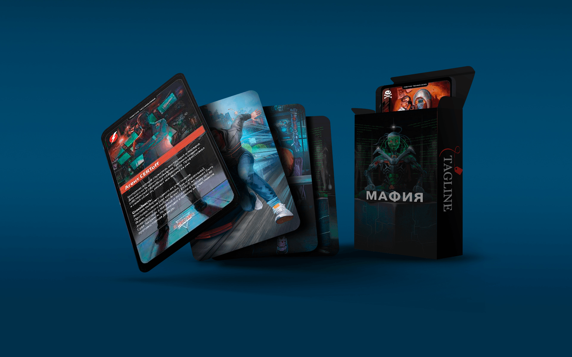 Компания Positive Technologies, специализирующаяся на решениях в области информационной безопасности, поставила перед нами задачу разработать уникальную тематическую колоду карт для игры «Мафия». Особенностью проекта стало то, что в качестве персонажей колоды должны были выступить сами сотрудники компании, представленные в стилистике киберпанка.