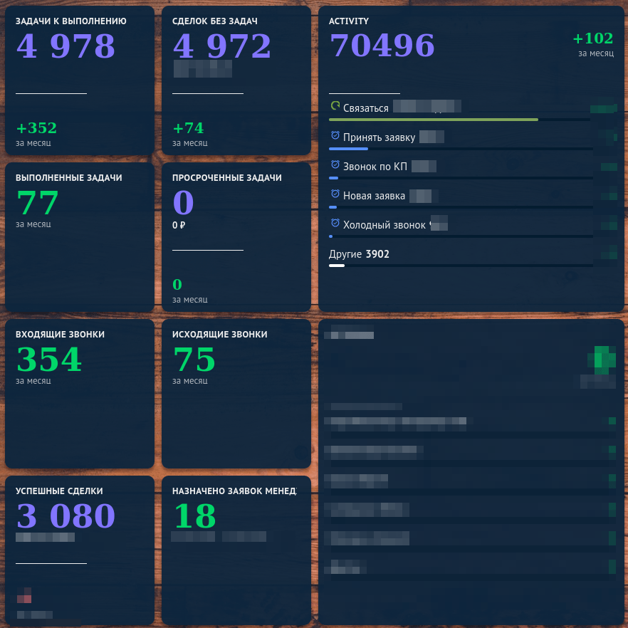 создание воронок продаж по нескольким направлениям: продажи дистрибьюторам, розничные продажи, закупки, доставка, маркетплейсы, рекламации, мероприятия;