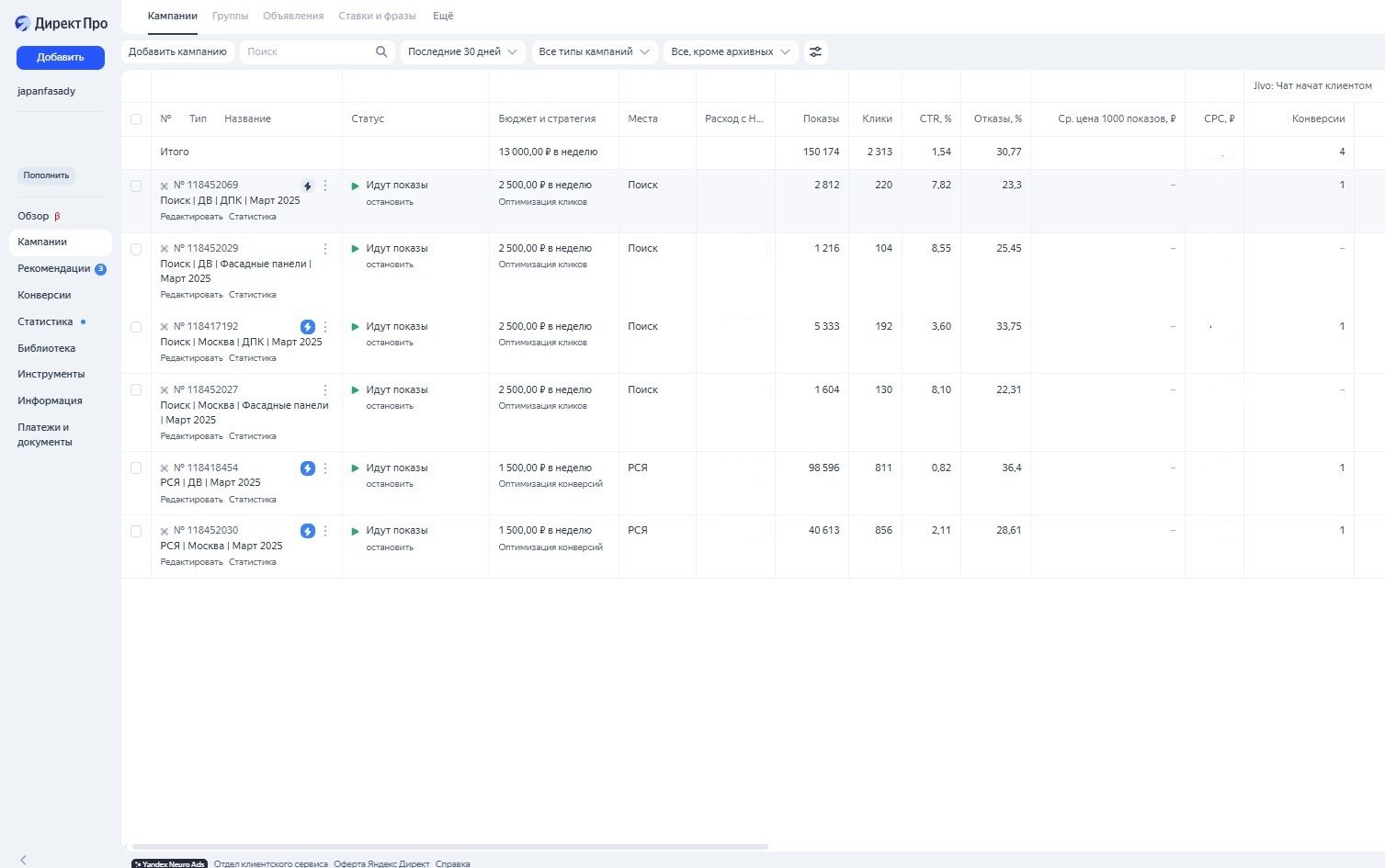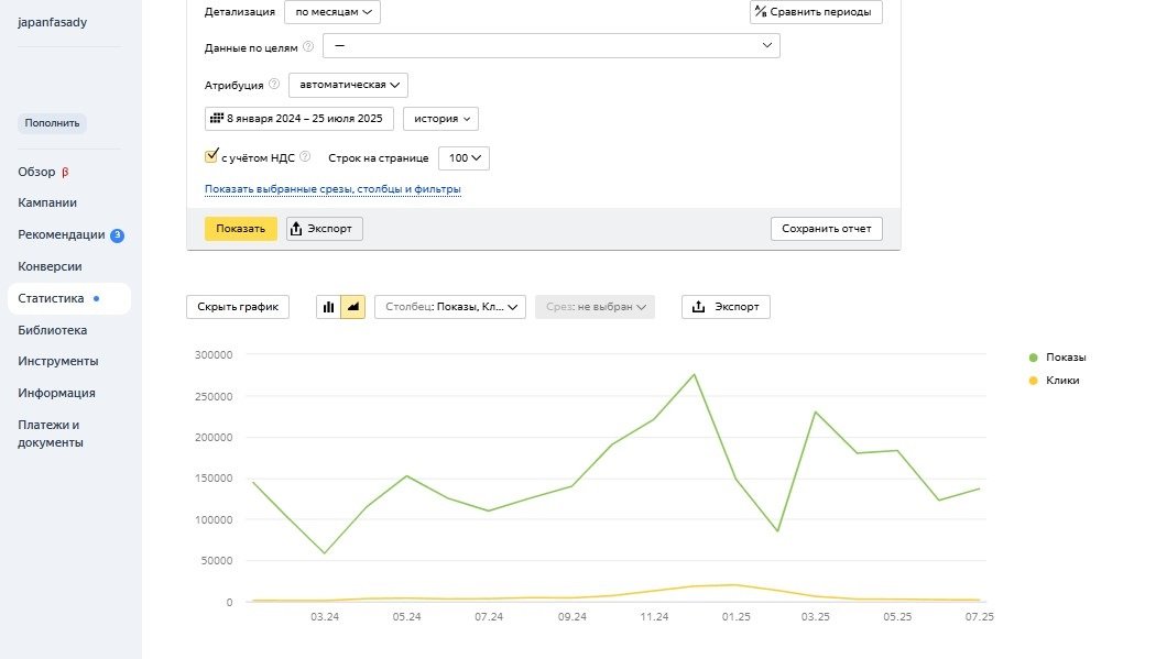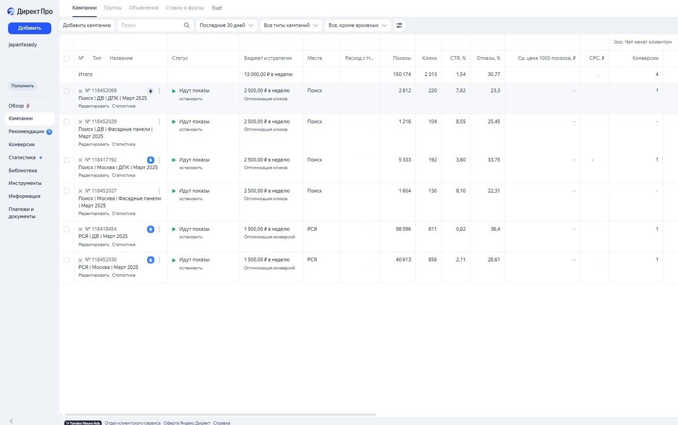 Рекламная кампания обеспечила стабильный поток целевой аудитории как из поиска, так и из Рекламной сети Яндекса. Удалось эффективно охватить аудиторию, заинтересованную именно в японских фасадных решениях, и усилить присутствие бренда как на Дальнем Востоке, так и в Центральной России. Рекламная система работает динамично и продолжает масштабироваться вместе с ростом бизнеса.