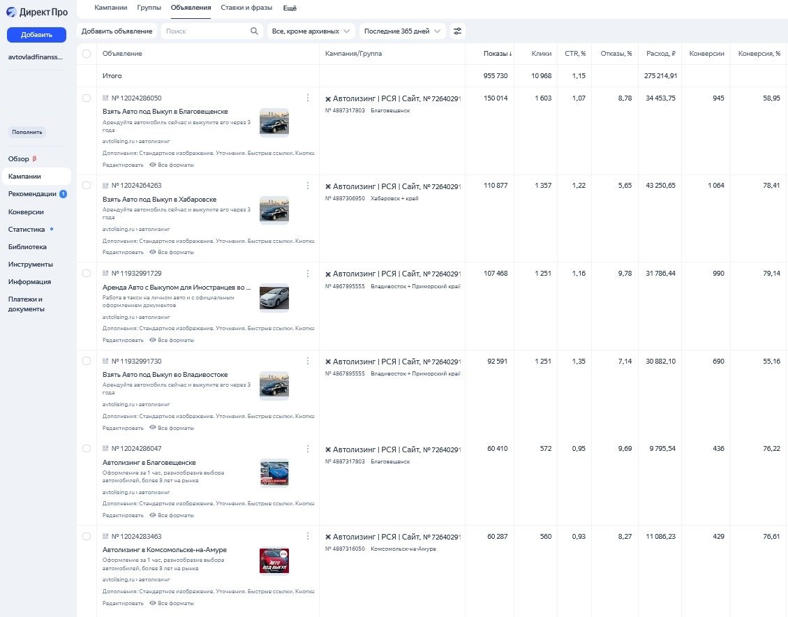 Кампания обеспечивает стабильный поток целевых лидов со средней стоимостью около 300 рублей. Реклама работает настолько эффективно, что при дефиците автомобилей у клиента её приходится временно приостанавливать. После обновления ассортимента объявления быстро возвращаются в эфир и стабильно достигают заданных KPI.