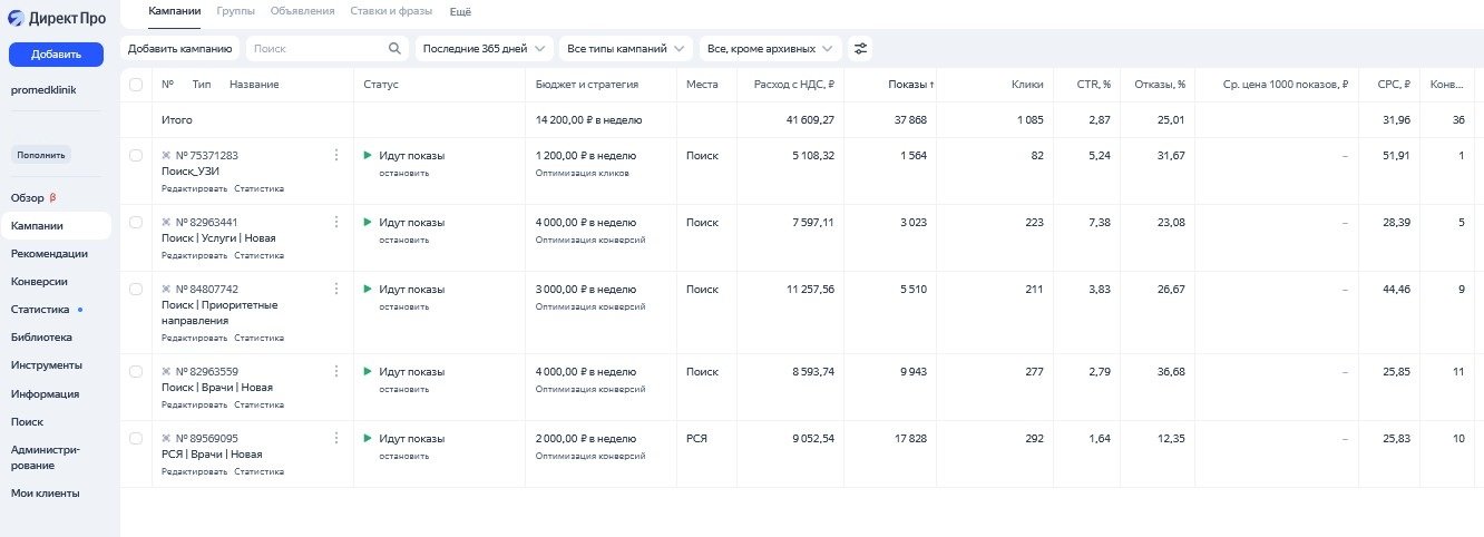 Клиент стабильно удерживает топовые позиции в поиске по ключевым направлениям и получает более 200 обращений в месяц — звонков и заявок от реальных пациентов. Рекламная кампания обеспечивает медицинскому центру «Промедклиник» постоянный поток целевых клиентов и укрепляет его позиции на рынке Нижнего Новгорода.