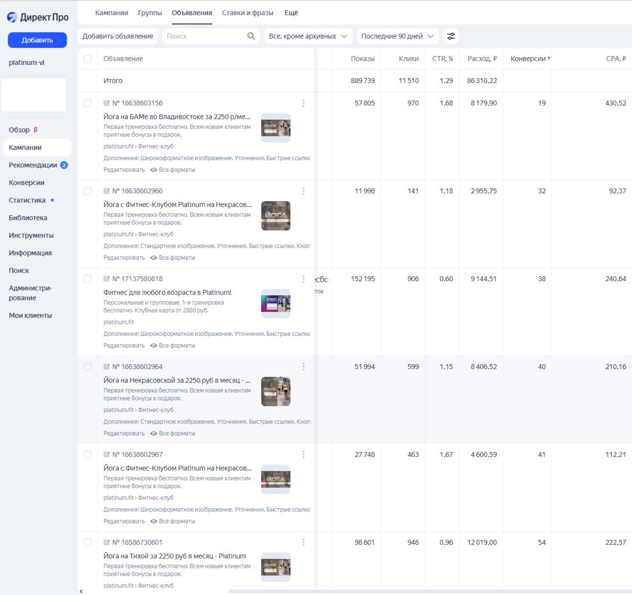 Обеспечить стабильное присутствие бренда «Платинум» в топе поисковой выдачи и создать широкое охватное представление в Рекламной сети Яндекса (РСЯ), эффективно конкурируя с другими фитнес-клубами Владивостока. Цель — привлечение новых клиентов и регулярное пополнение базы посетителей.