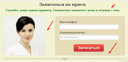 Доработали форму: устранили ошибки отправки, разместили фото врача, добавили текст подтверждение отправки.