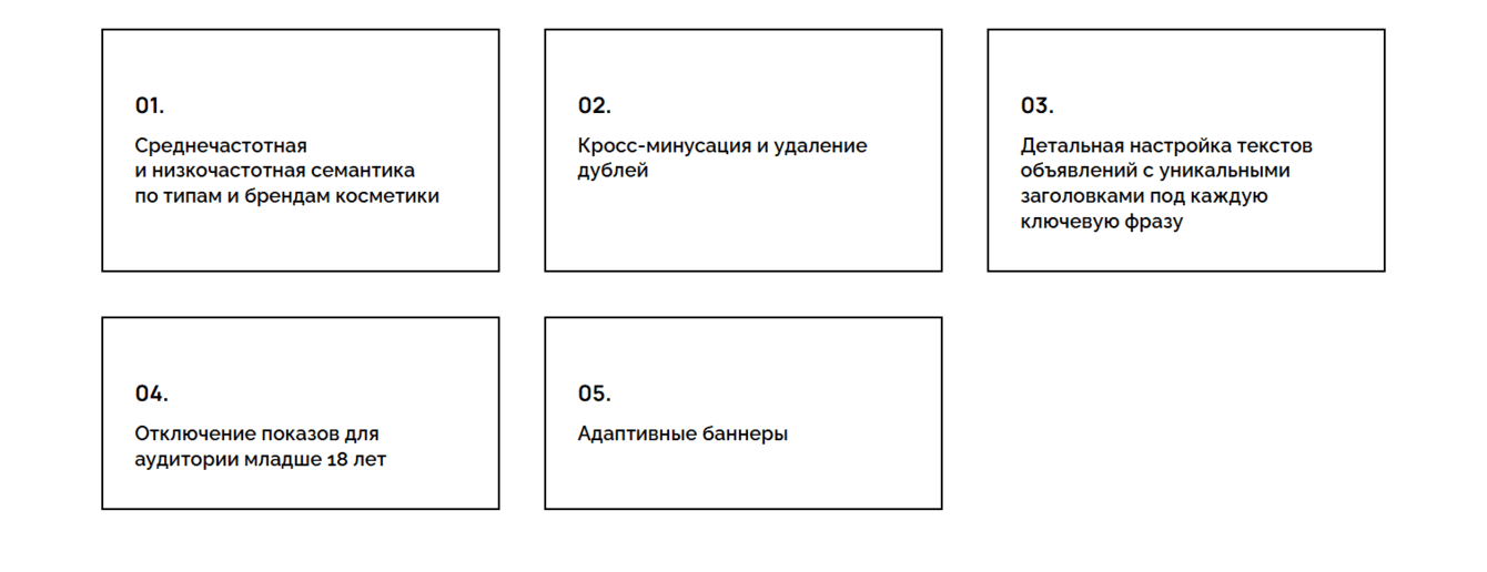 Для достижения поставленных целей была разработана комплексная стратегия продвижения. В рамках поисковой рекламы мы собрали семантическое ядро, включающее средне- и низкочастотные запросы по типам и брендам косметики. Особое внимание уделялось качеству рекламных материалов: использовались уникальные заголовки для каждого запроса, внедрялись адаптивные баннеры и проводилась кросс-минусация для исключения дублей.