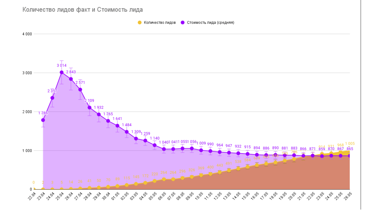 Несколько недель мы безуспешно тестировали разные настройки и не получали ни одной конверсии, пока наконец не нашли верную комбинацию, которая начала приносить лиды. Именно связка "Одноблоковый лендинг + Мастер кампаний" в течение первой недели принесла нам несколько десятков лидов, а затем постепенно с каждой неделей приносила все больше.