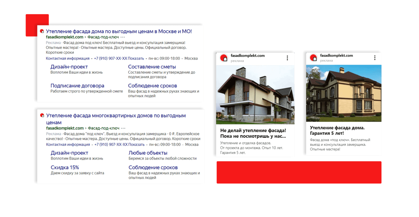 Тексты объявлений и расширения были разработаны профессионально, и для каждой группы объявлений было подготовлено по 4 варианта текстов. Максимально привлекательный вид объявлений обеспечивали все доступные типы расширений, включая мобильные объявления.