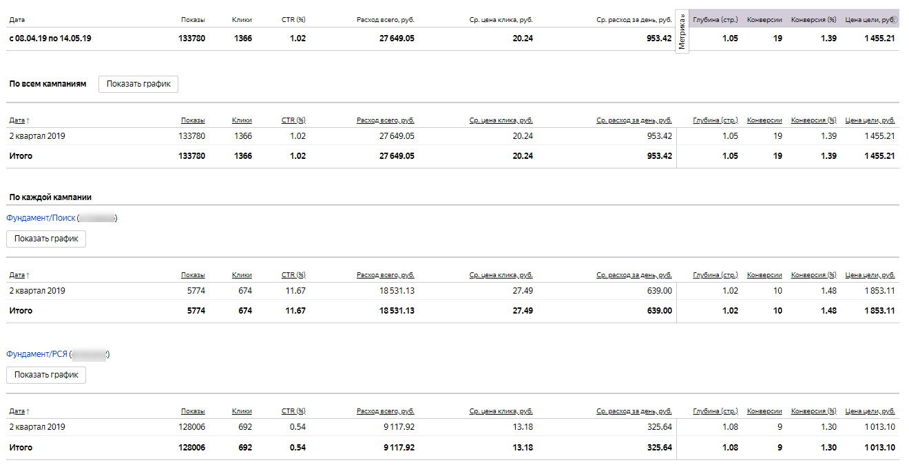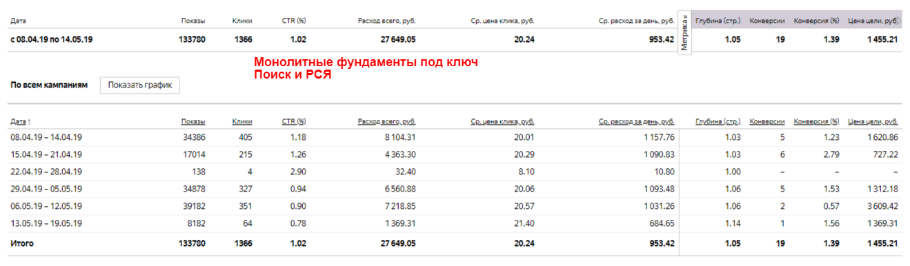 С 08.04.2019г. по 14.05.2019г.: показы — 133780, 1366 кликов, 1,02% CTR (Поиск+РСЯ), расход бюджета — 27649,05 руб., средняя цена клика 20,24 руб., средний расход в день — 953,42 руб., 19 достижений цели, 1,39% конверсии, цена конверсии — 1455,21 руб.