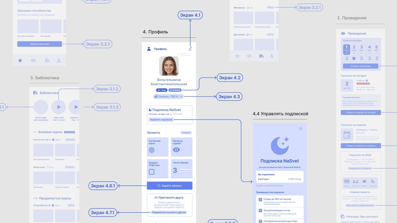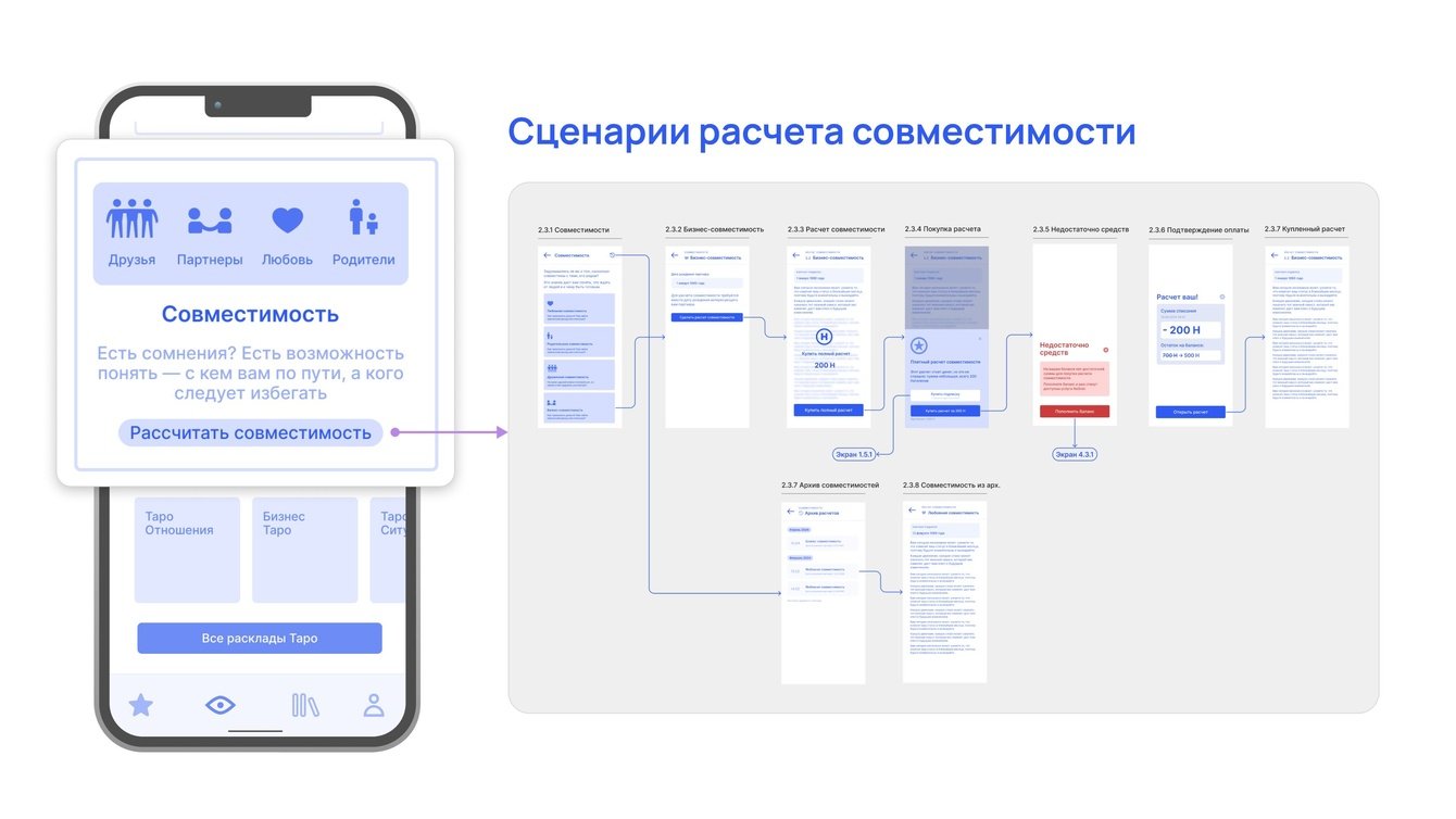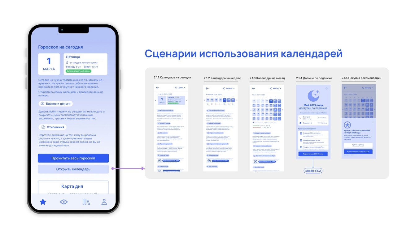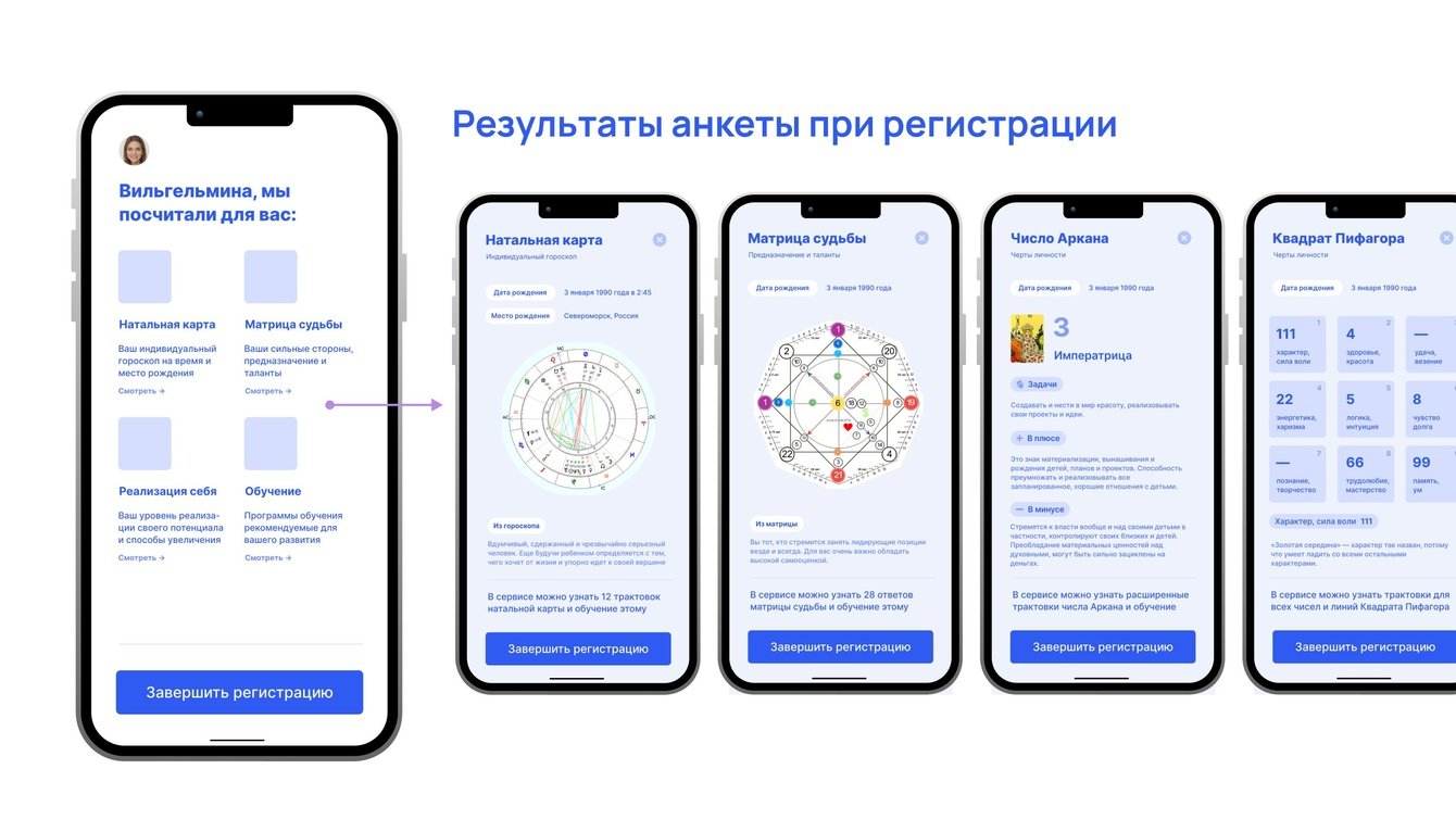 После регистрации пользователь получает натальную карту и матрицу судьбы, а затем попадает на главную страницу, откуда может перейти в нужный раздел. Несколько раз перестраивали пользовательский путь, пока не нашли оптимальный вариант.