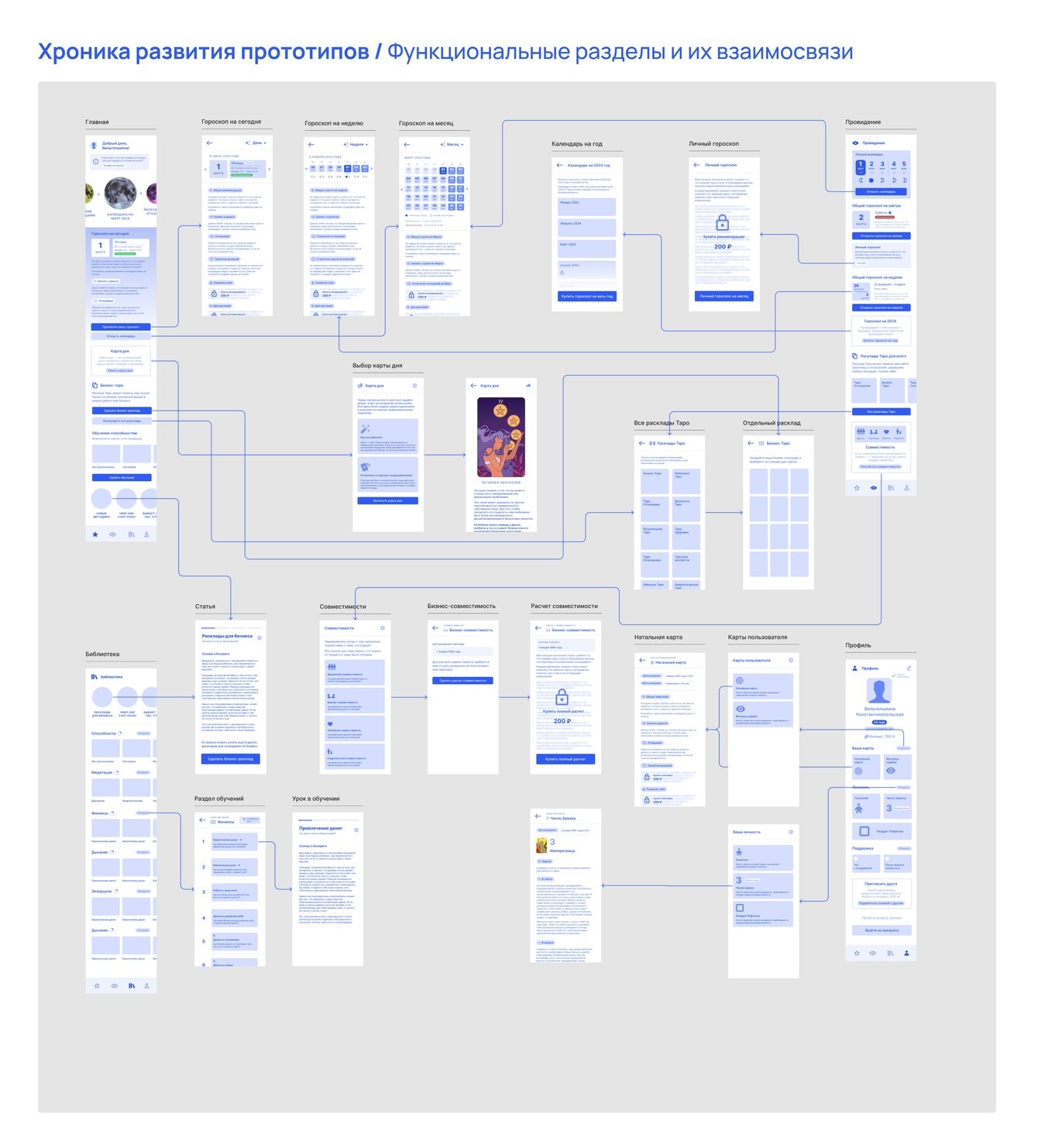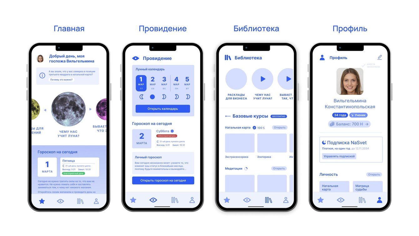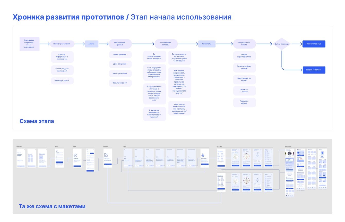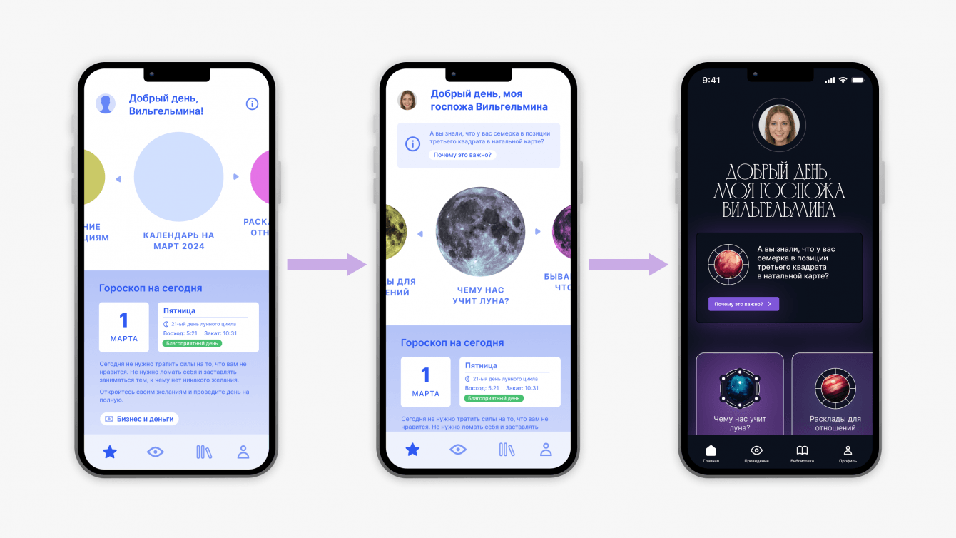 После регистрации пользователь получает натальную карту и матрицу судьбы, а затем попадает на главную страницу, откуда может перейти в нужный раздел. Несколько раз перестраивали пользовательский путь, пока не нашли оптимальный вариант.