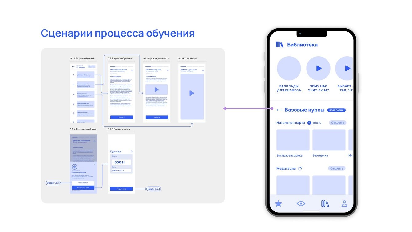 Логику системы обучения выстроили так, что приложение подбирает курсы по астрологии, нумерологии и осознанным практикам. Уроки доступны в текстовом и видеоформате, а доступ к расширенным материалам открывается по подписке или разовой покупке.