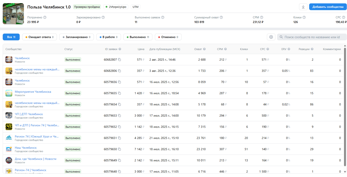 Мы проанализировали более 50 челябинских пабликов, оценили их по активности, демографии и тематике, выбрали 7 с наибольшим вовлечением, которые соответствовали интересам нашей целевой аудитории — ЗОЖ, здоровье и городские новости, чтобы охватить именно тех людей, которые потенциально придут в магазин.