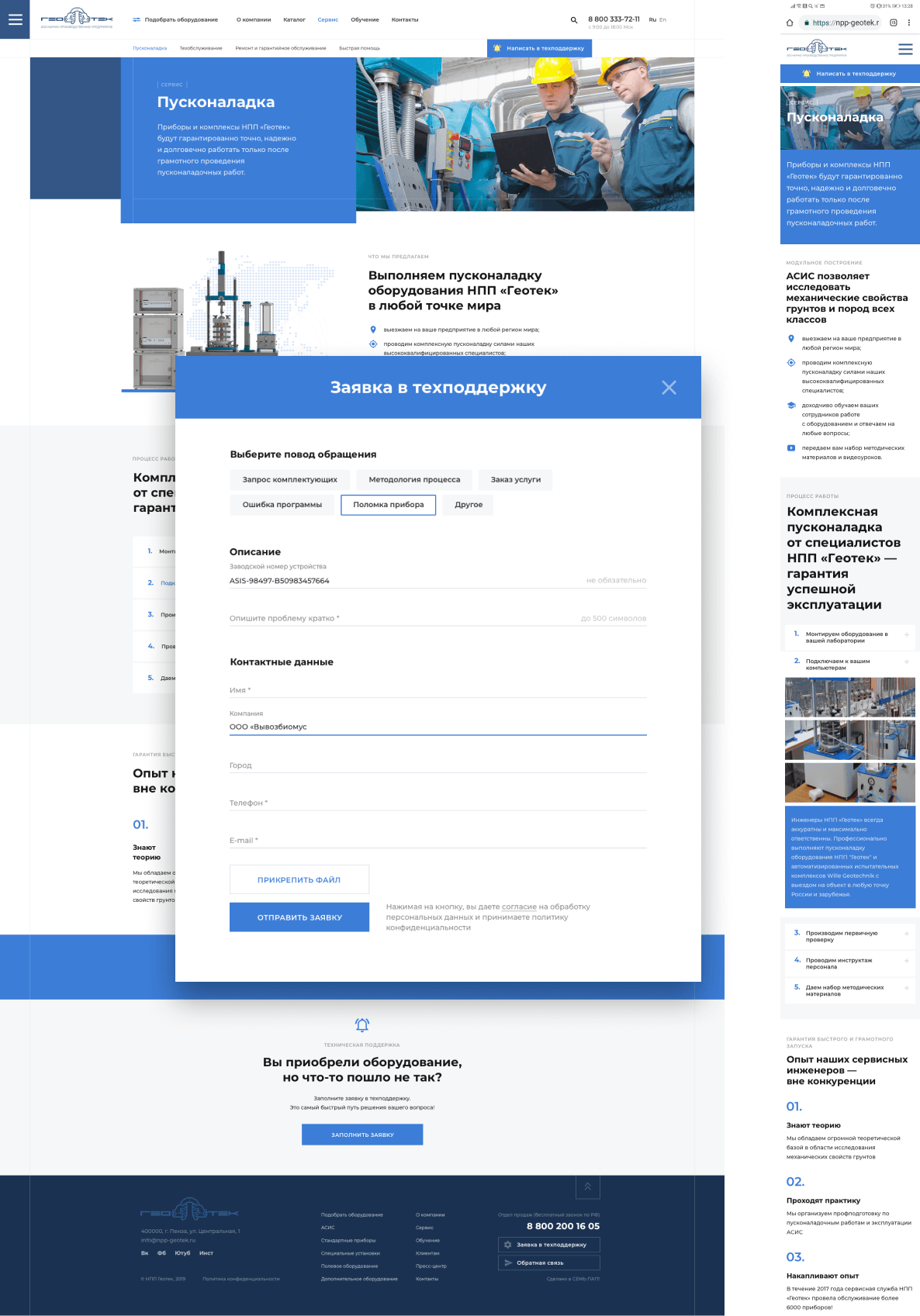 Иногда счастливым обладателям уникального оборудования от НПП «Геотек» очень нужно узнать, почему оно вдруг перестало работать. Часто решение проблемы — сущий пустяк, но клиенты привыкли звонить сейлз-менеджерам, отвлекая их от прямых обязанностей. Мы снизили вероятность таких звонков. Стоит отметить, что высокий уровень послепродажного сервиса — важное конкурентное преимущество компании и оно помогает продавать. Поэтому мы представили его во всей красе — четко и наглядно.