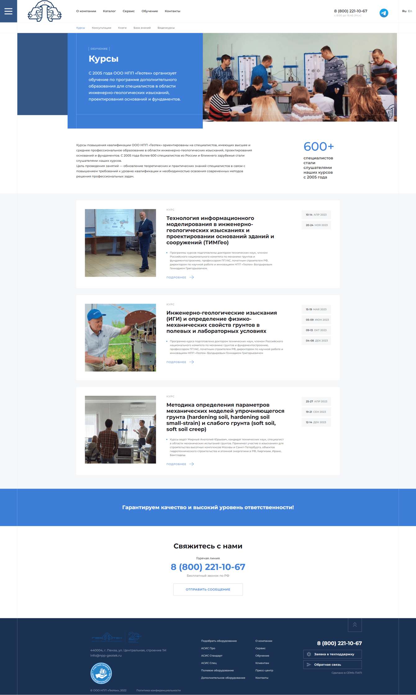 У «Геотек» накопилось огромное количество научных публикаций, мастер-классов, лекций, статей, а также напечатанных книг, которыми компания готова поделиться. На новом сайте студенты и специалисты в сфере исследования горных пород могут без труда найти нужную им учебную информацию. Кроме того, «Геотек» регулярно проводит очные практические мастер-классы. Мы сообщили о преимуществах обучения, дали возможность выбрать дату и записаться.