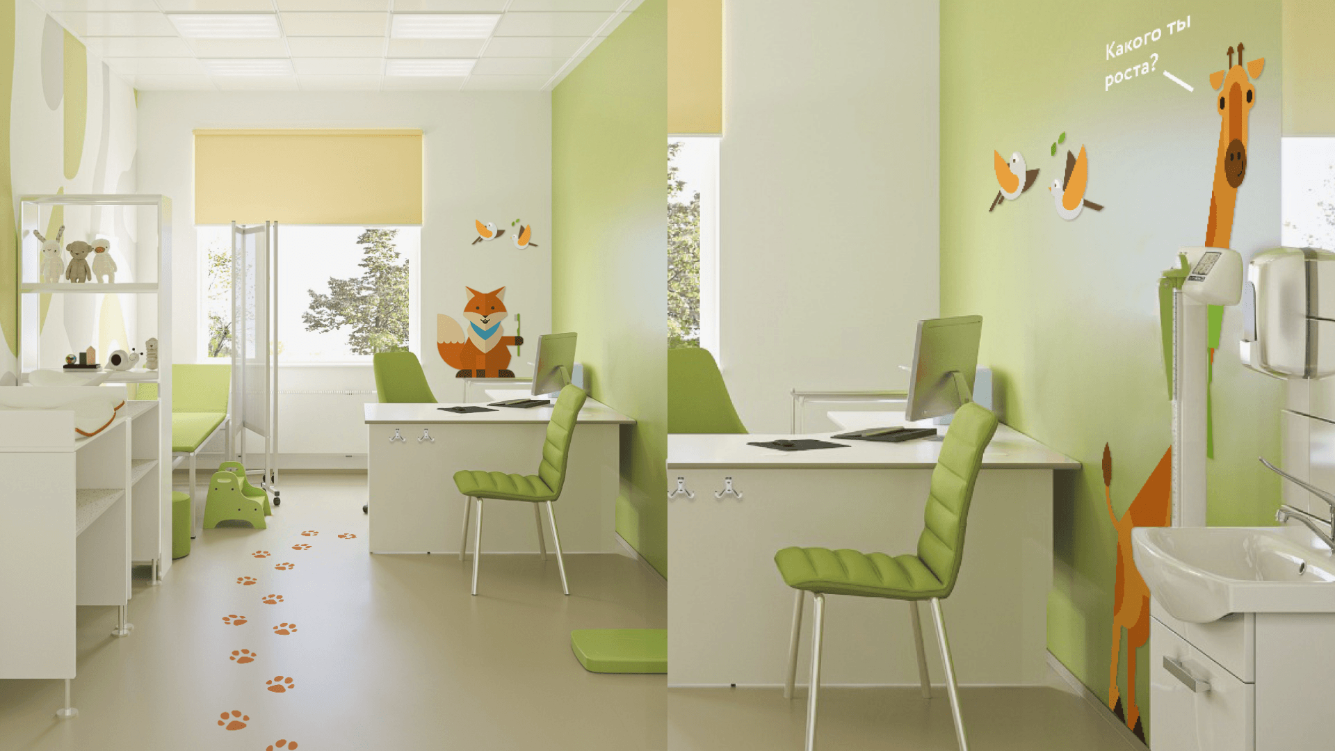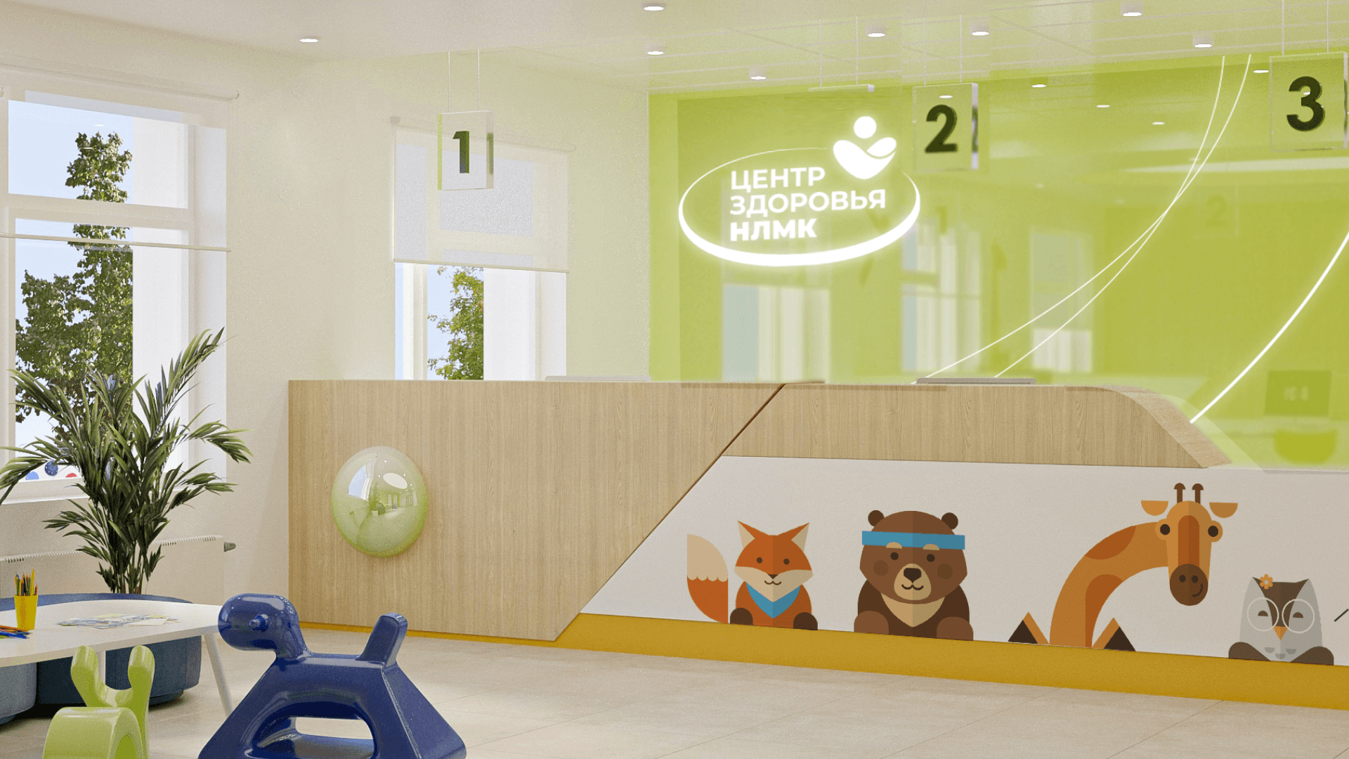 Здание медцентра состоит из трёх разноэтажных блоков, соединённых между собой переходами. В самом медцентре располагается детское и взрослое отделение, а также стационар. Есть блоки для сотрудников завода и для горожан… Для того, чтобы развести потоки посетителей с разными запросами (дети, взрослые, инфицированные больные, платные клиенты, сотрудники, пришедшие на регулярный профосмотр и т.д.), необходимо было создать понятную и наглядную систему навигации.