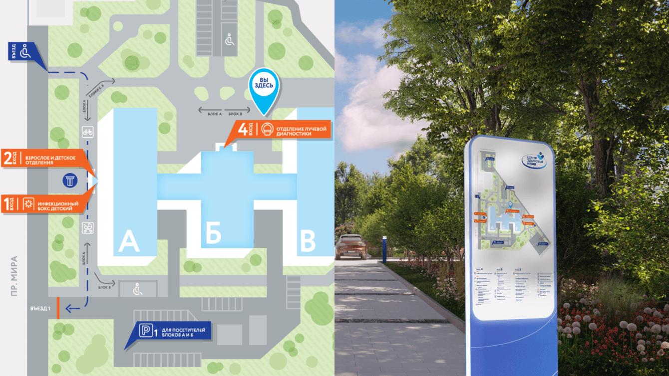 Реконструкция медицинского центра повлекла за собой необходимость создать ясную и логичную систему навигации — чтобы посетителям на каждом шагу было понятно, как найти нужный вход в здание и пройти в нужный кабинет.