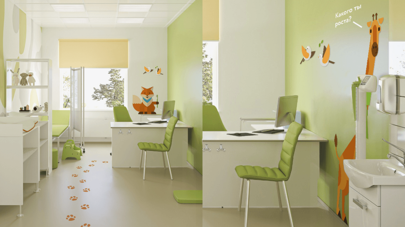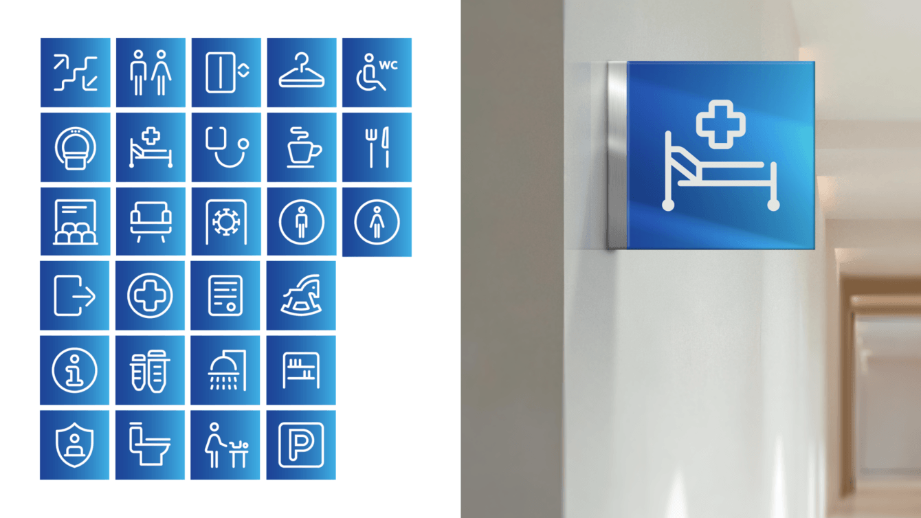 Следующим шагом стала разработка системы пиктограмм для кабинетов, а также цветовое зонирование отделений. Затем — создание макетов всех инфостендов с подробной и понятной разводкой по этажам и отделениям, дизайн кабинетных табличек, настенной навигации и других навигационных носителей, позволяющих без труда попасть в нужное место и найти нужного специалиста.