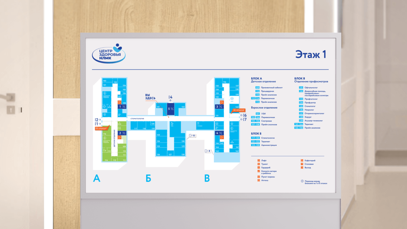 Разработанная нами навигация стала ещё одним инструментом трансляции ценностей Центра здоровья: комфорт и забота о человеке. Она решает вопрос ориентации посетителей как снаружи, так и внутри медцентра. Это не только делает удобным и комфортным процесс получения медицинских услуг, но и ещё раз подчёркивает образ бренда НЛМК как работодателя, обеспечивающего высочайший уровень заботы и медицинского сервиса как для своих сотрудников, так и для и жителей Липецка в целом.