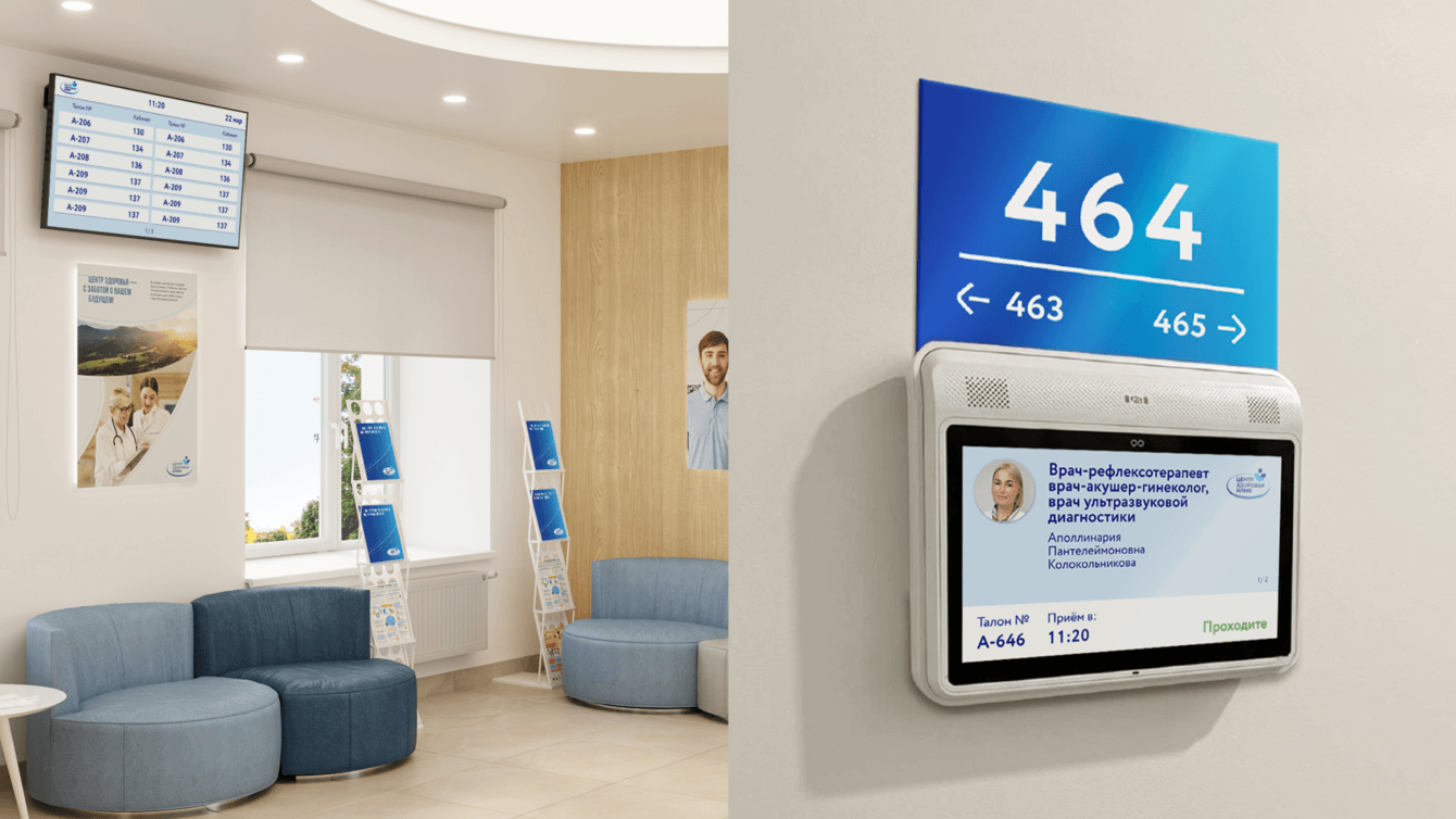 Кроме того, мы разработали макеты экранов для мониторов электронной очереди и медтабло с удобным и понятным интерфейсом. Завершающим этапом стал дизайн элементов уличной навигации, размещённых на подходе к зданию Центра здоровья, среди которых — 4-метровые имиджевые стеллы, которые благодаря удачно подобранному расположению видно отовсюду.