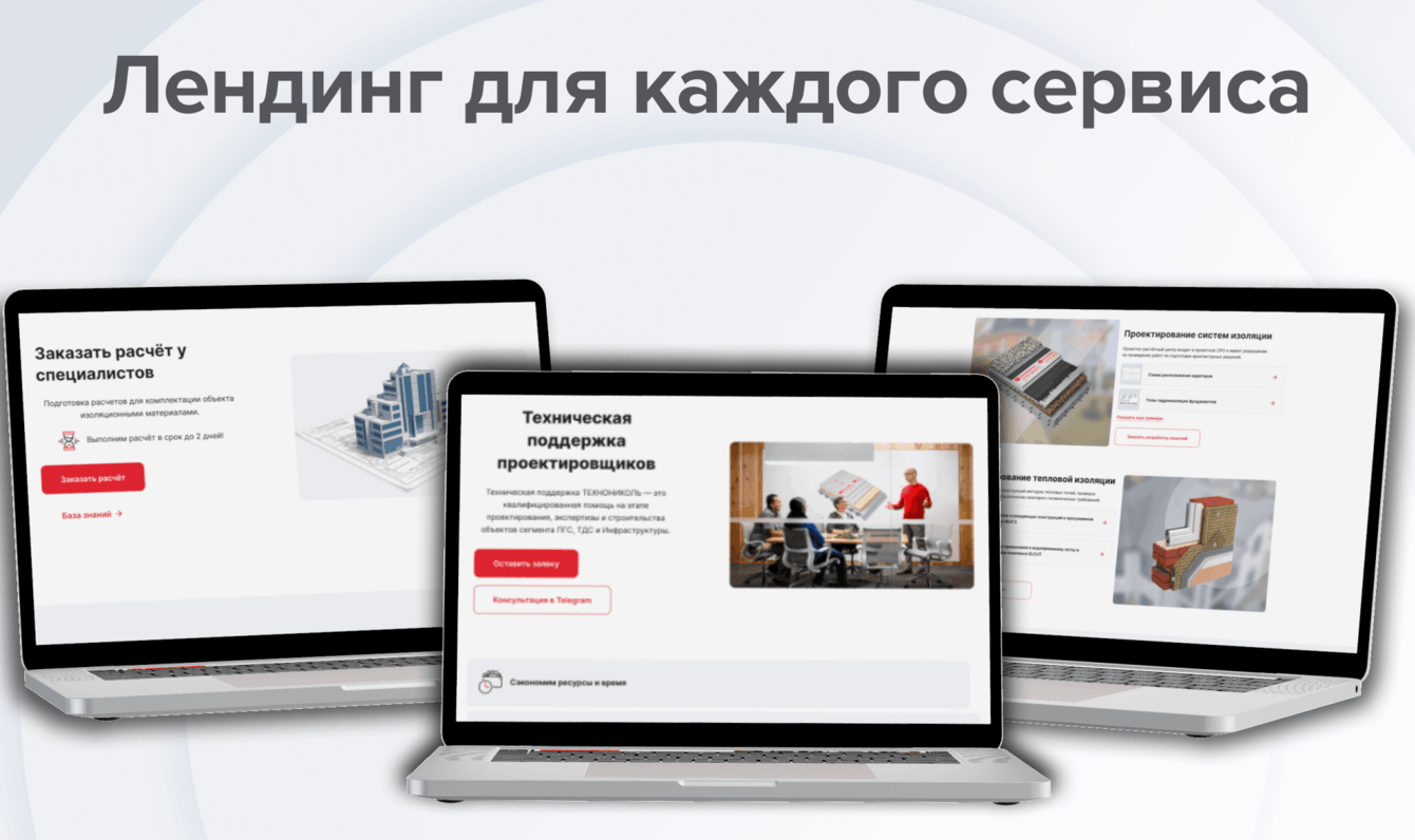 Дальше пользователь может нажать на «все сервисы» и узнать о каждом подробнее. Если пользователя заинтересует конкретный сервис, его переадресует на отдельный лендинг. Мы отрисовали 11 уникальных страниц с возможностью их предпросмотра.