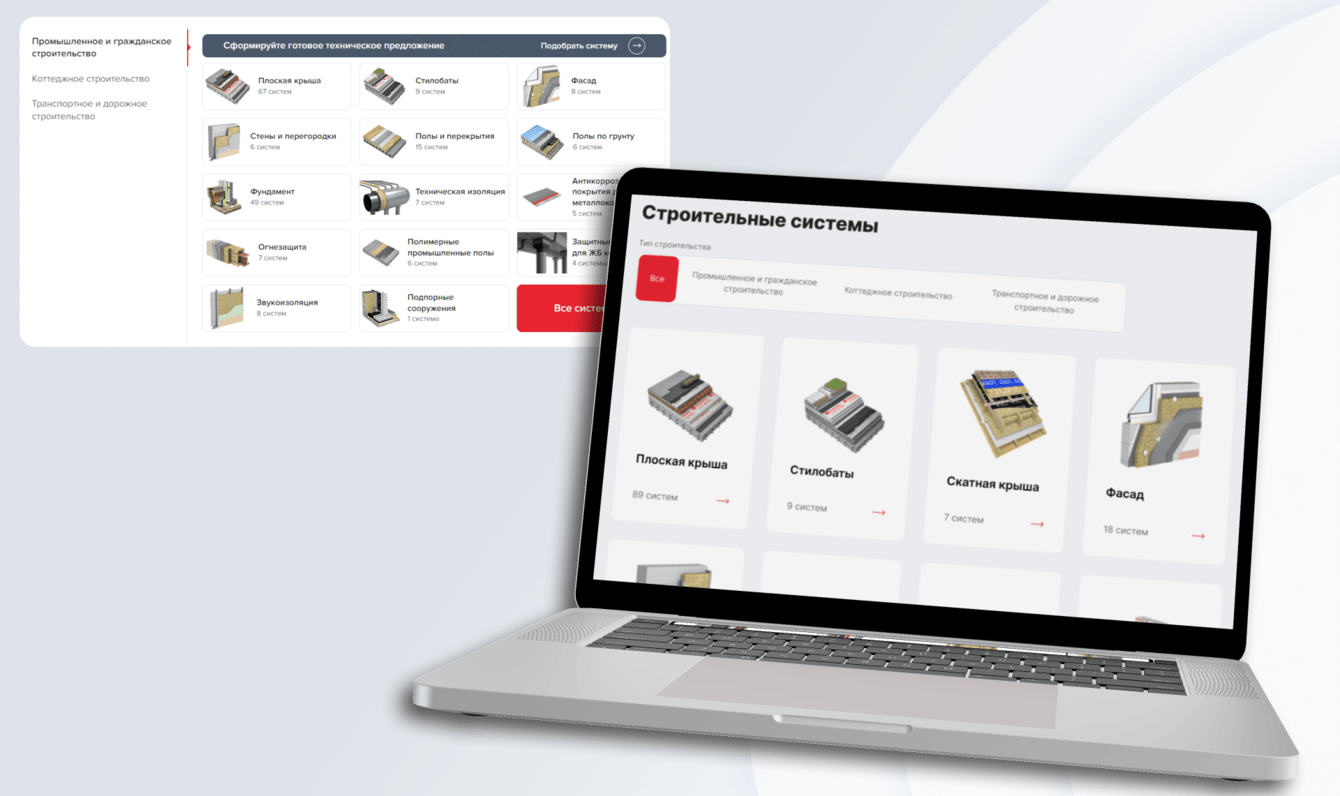 Пользователь также может перейти на «подбор систем» в виде опроса. Здесь вы можете выбрать тип строительства, тип конструкции и так далее. На основе прохождения опроса сервис предлагает вам готовое решение, которое наилучшим образом подойдет вам.