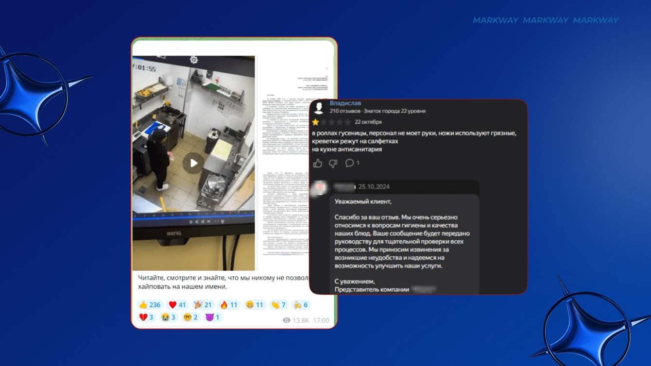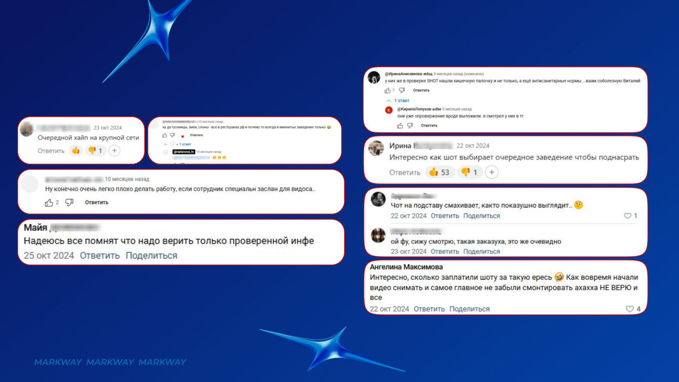Проблема: 21 октября 2024 года в Telegram-канале SHOT появился анонс «расследования» об антисанитарии в одном из ресторанов сети. На следующий день вышло видео, которое было подано как «утечка от бывшего сотрудника». Ролик снят в вертикальном формате на смартфон, что усиливает эффект «инсайдерской информации».