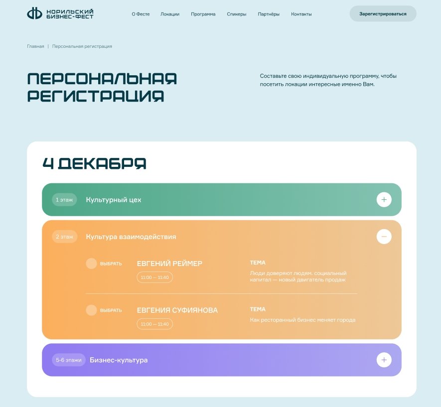 - Сделали кастомную персональную регистрацию на сайте на каждого спикера на каждой площадке на каждый день.