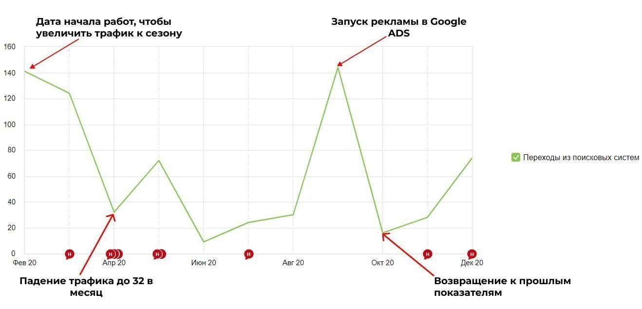 Предыдущий подрядчик, перед тем как уйти, решил настроить рекламу в Google Ads и не записывать переходы как рекламные, чтобы показать клиенту, мол, компания дала результат. Поэтому на конец работ мы имеем небольшой рост, но на самом деле трафик на сайте только падал, и это отражено на скриншоте.